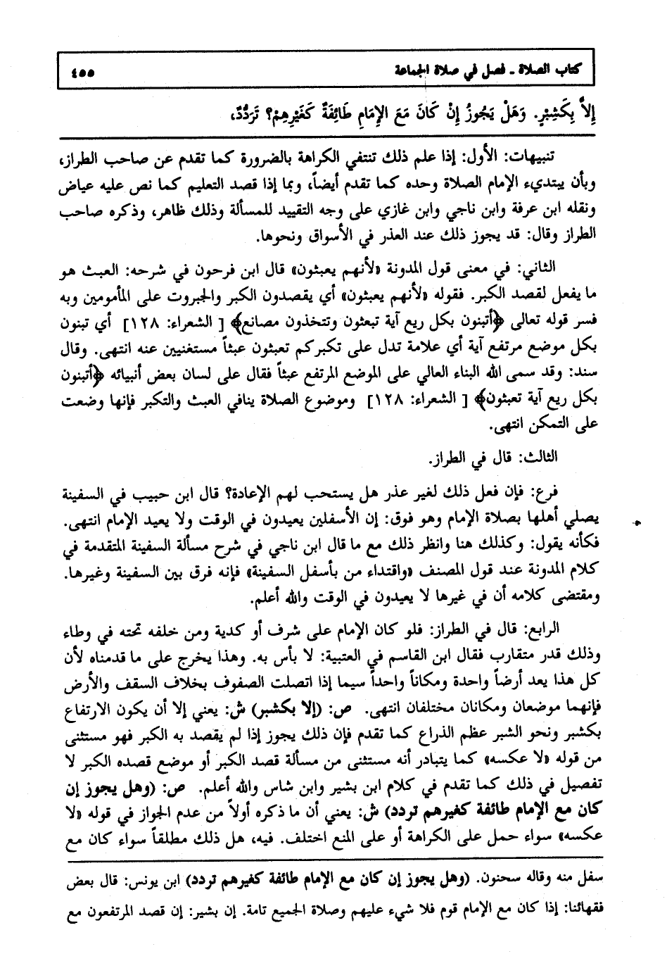 تنبيهات: الأول : إذا علم ذلك تنتفي الكراهة بالضرورة كما تقدم عن صاحب الطراز وبأن يبتدئ الإمام الصلاة وحده كما تقدم أيضا وبما إذا قصد التعليم كما نص عليه عياض, ونقله ابن عرفة وابن ناجي وابن غازي على وجه التقييد للمسألة وذلك ظاهر. وذكره صاحب الطراز, وقال قد يجوز ذلك عند العذر في الأسواق ونحوها.