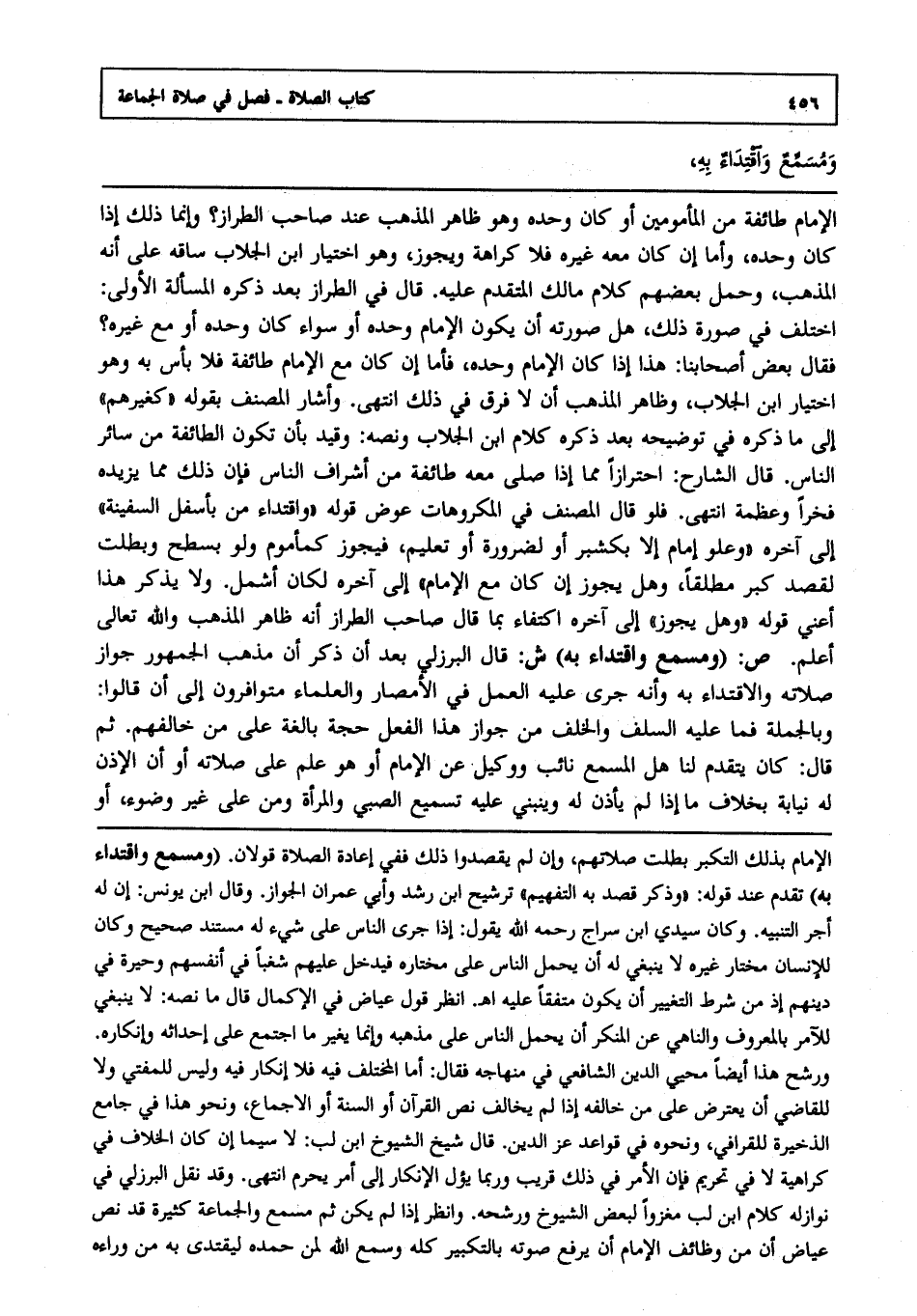 ص ومسمع واقتداء به" ش: قال البرزلي بعد أن ذكر أن مذهب الجمهور جواز صلاته والاقتداء به, وأنه جرى عليه العمل في الأمصار والعلماء متوافرون إلى أن قالوا وبالجملة فما عليه السلف والخلف من جواز هذا الفعل حجة بالغة على من خالفهم, ثم قال: وكان يتقدم لنا هل المسمع نائب ووكيل عن الإمام أو هو علم على صلاته أو أن الإذن له نيابة بخلاف ما إذا لم يأذن له وينبني عليه تسميع الصبي والمرأة ومن على غير وضوء أو