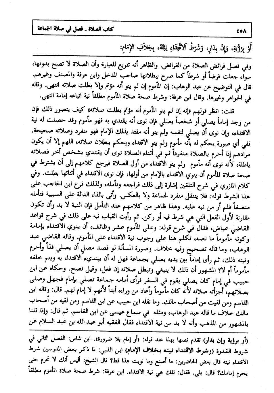 وفي فصل فرائض الصلاة من الفرائض والظاهر أنه تنويع للعبارة, وأن الصلاة لا تصح بدونها سواء جعلت فرضا أو شرطا كما صرح ببطلانها صاحب المدخل وابن عرفة والمصنف وغيرهم قال في التوضيح عن عبد الوهاب أن المأموم إن لم ينو أنه مؤتم وإلا بطلت صلاته انتهى, وقاله في الجواهر وغيرها, وقال ابن عرفة: وشرط صحة صلاة المأموم مطلقا نية اتباعه إمامه انتهى.