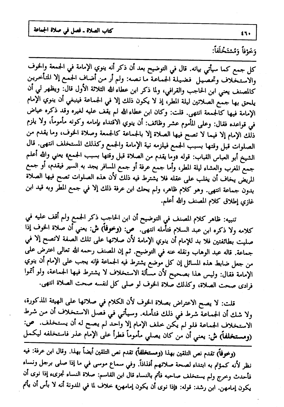 تنبيه : ظاهر كلام المصنف في التوضيح أن ابن الحاجب ذكر الجمع, ولم أقف عليه في كلامه ولا ذكره ابن عبد السلام فتأمله انتهى. ص: "وخوفا" ش: يعني أن صلاة الخوف إذا صليت بطائفتين فلا بد للإمام أن ينوي الإمامة ; لأن صلاتها على تلك الصفة لا تصح إلا في جماعة قاله عبد الوهاب, ونقله عنه في التوضيح, ثم إن المصنف - رحمه الله تعالى - اعترض على من جعل ضابط هذه المسائل أن كل موضع يشترط فيه الجماعة فإنه يجب على الإمام أن ينوي الإمامة فقال: وليس هذا بصحيح ; لأن مسألة الاستخلاف لا يشترط فيها الجماعة, ولو أتموا فرادى صحت الصلاة, وكذلك صلاة الخوف لو صلى كل لنفسه صحت الصلاة انتهى.