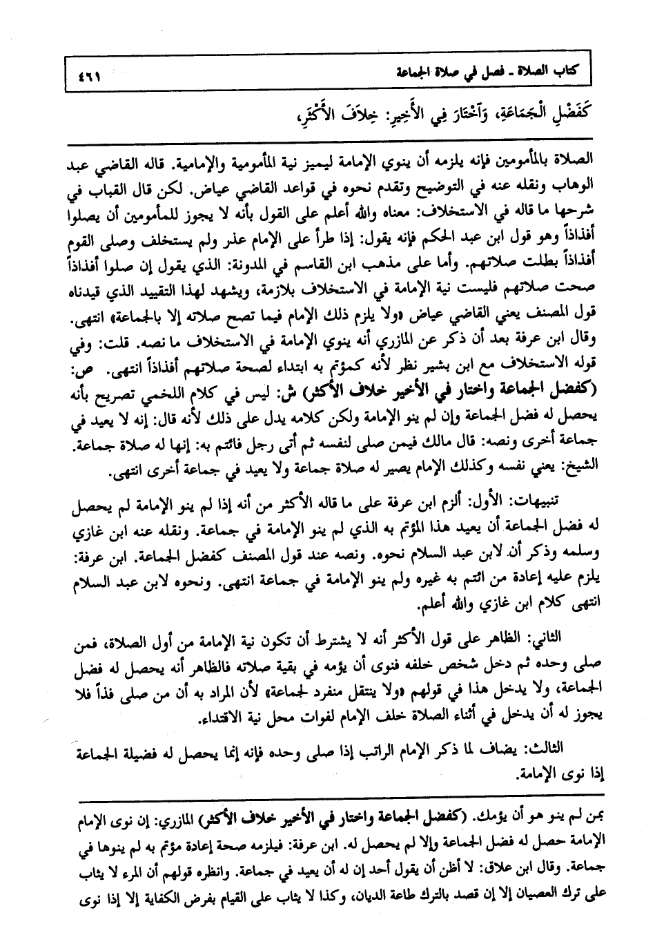 كفضل الجماعة واختار في الأخير خلاف الأكثر