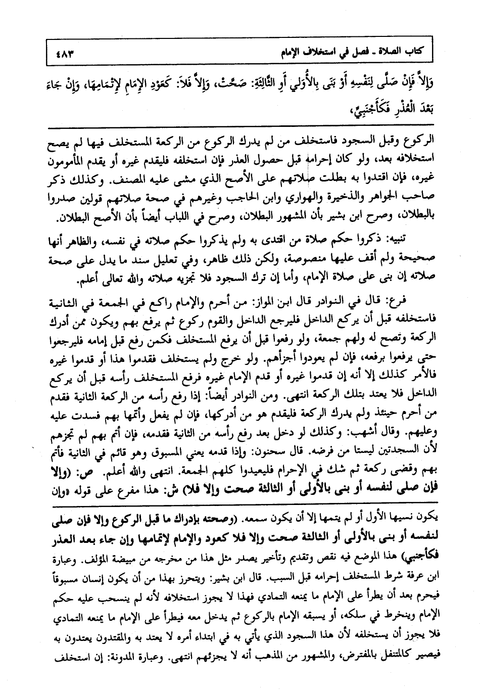 الركوع وقبل السجود فاستخلف من لم يدرك الركوع من الركعة المستخلف فيها لم يصح استخلافه بعد, ولو كان إحرامه قبل حصول العذر, فإن استخلفه فليقدم غيره, أو يقدم المأمومون غيره, فإن اقتدوا به بطلت صلاتهم على الأصح الذي مشى عليه المصنف, وكذلك ذكر صاحب الجواهر والذخيرة والهواري وابن الحاجب وغيرهم في صحة صلاتهم قولين صدروا بالبطلان وصرح ابن بشير بأن المشهور البطلان وصرح في اللباب أيضا بأن الأصح البطلان.