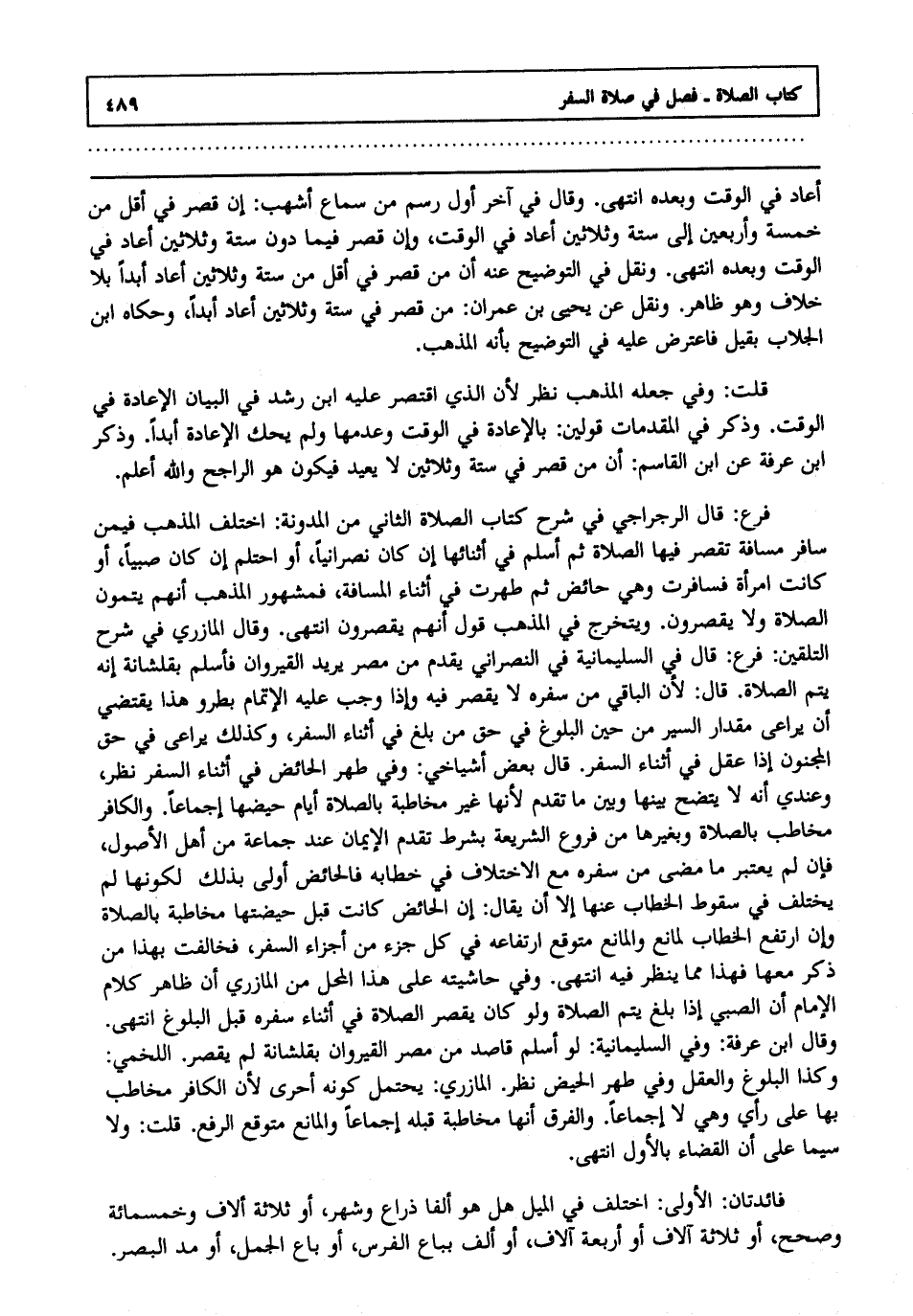 قلت: وفي جعله المذهب نظر ; لأن الذي اقتصر عليه ابن رشد في البيان الإعادة في الوقت, وذكر في المقدمات قولين بالإعادة في الوقت وعدمها, ولم يحك الإعادة أبدا, وذكر ابن عرفة عن ابن القاسم أن من قصر في ستة وثلاثين لا يعيد فيكون هو الراجح, والله أعلم.