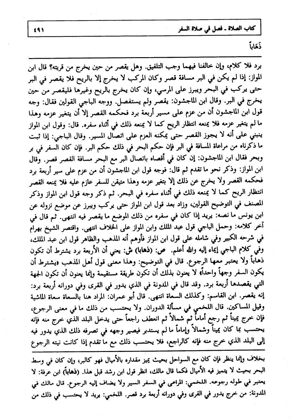 برد فلا كلام, وإن خالفنا فيهما وجب التلفيق, وهل يقصر من حين يخرج من قريته ؟ قال ابن المواز: إذا لم يكن في البر مسافة قصر, وكان المركب لا يخرج إلا بالريح فلا يقصر في البر حتى يركب في البحر ويبرز على المرسى, وإن كان يخرج بالريح وغيرها فليقصر من حين يخرج في البر, وقال ابن الماجشون: يقصر ولم يستفصل, ووجه الباجي القولين فقال: وجه قول ابن الماجشون أن من عزم على مسير أربعة برد فحكمه القصر إلا أن يتغير عزمه, وهذا ما لم يتغير عزمه فلا يمنعه انتظار الريح كما لا يمنعه ذلك في أثناء سفره, قال: وقول ابن المواز ينبني على أنه لا يجوز القصر حتى يمكنه العزم على اتصال المسير, وقال الباجي: إذا ثبت ما ذكرناه من مراعاة المسافة في البر فإن حكم البحر في ذلك حكم البر, فإن كان السفر في بر وبحر فقال ابن الماجشون: إن كان في أقصاه باتصال البر مع البحر مسافة القصر قصر, وقال ابن المواز وذكر نحو ما تقدم, ثم قال: فوجه قول ابن الماجشون أن من عزم على سير أربعة برد فحكمه القصر ولا يخرج عن ذلك إلا بتغير عزمه, وهذا متيقن للسفر عازم عليه فلا يمنعه القصر انتظار الريح كما لا يمنعه ذلك في أثناء سفره في البحر, ثم ذكر وجه قول ابن المواز, وذكر المصنف في التوضيح القولين وزاد بعد قول ابن المواز حتى يركب ويبرز عن موضع نزوله عن ابن يونس ما نصه يريد إذا كان في سفره من ذلك الموضع ما يقصر فيه انتهى. ثم قال في آخر كلامه: وحمل الباجي قول عبد الملك وابن المواز على الخلاف انتهى. واقتصر الشيخ بهرام في شرحه الكبير, وفي شامله على قول ابن المواز فأوهم أنه المذهب, والظاهر قول ابن عبد الملك, وفي كلام الباجي إيماء إليه, والله أعلم. ص: "ذهابا" ش: يعني أن الأربعة برد يشترط أن تكون ذهابا ولا يعتبر معها الرجوع, قال في التوضيح: وهذا معنى قول أهل المذهب: يشترط أن يكون السفر وجها واحدا, لا يعنون بذلك أن تكون طريقة مستقيمة, وإنما يعنون أن تكون الجهة التي يقصدها أربعة برد, وقد قال في المدونة في الذي يدور في القرى وفي دورانه أربعة برد: إنه يقصر ابن القاسم, وكذلك السعاة انتهى. قال أبو عمران: المراد هنا بالسعاة سعاة الماشية, وقيل المساكين, قال اللخمي في مسألة الدوران ولا يحتسب من ذلك ما في معنى الرجوع, فإن خرج يمينا, ثم رجع أماما, ثم شمالا, ثم انعطف راجعا حتى يدخل البلد الذي خرج منه فإنه يحتسب بما كان يمينا وشمالا وأماما ما لم يستدبر فيصير وجهه في تصرفه ذلك الذي يدور فيه إلى البلد الذي خرج منه فإنه كالراجع فلا يحتسب ذلك مع ما تقدم إذا كانت نيته الرجوع