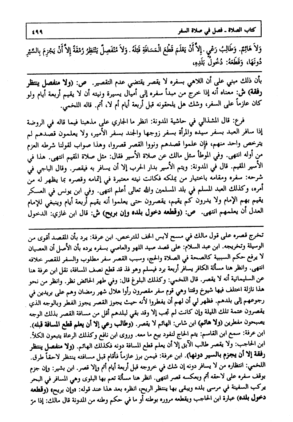 بأن ذلك مبني على أن اللاهي بسفره لا يقصر - يقتضي عدم التقصير ص: "ولا منفصل ينتظر رفقة" ش: معناه أنه إذا خرج من مبدأ سفره إلى أميال يسيرة ونيته أن لا يقيم أربعة أيام, ولو كان عازما على السفر وشك هل يلحقونه قبل أربعة أيام أم لا أتم قاله اللخمي.