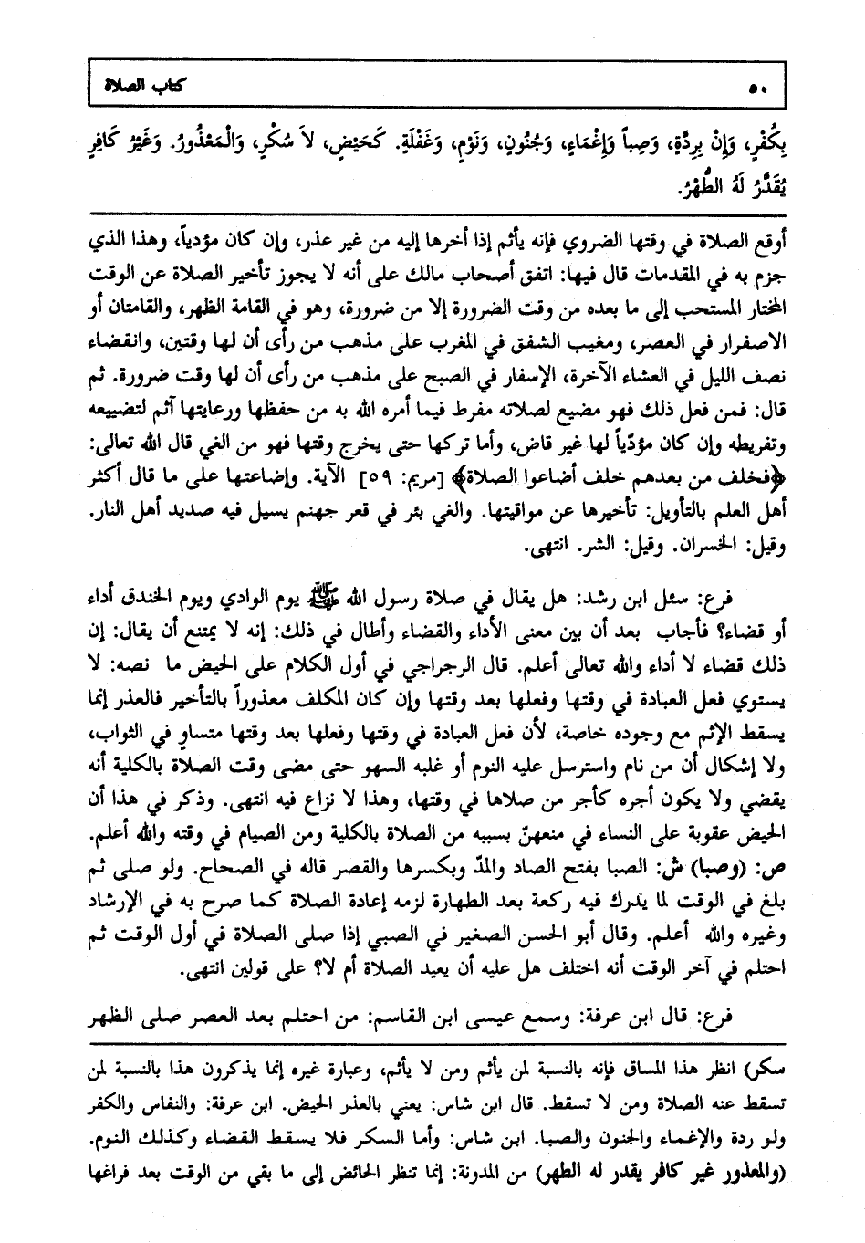 أوقع الصلاة في وقتها الضروي فإنه يأثم إذا أخرها إليه من غير عذر وإن كان مؤديا وهذا الذي جزم به في المقدمات قال فيها اتفق أصحاب مالك على أنه لا يجوز تأخير الصلاة عن الوقت المختار المستحب إلى ما بعده من وقت الضرورة إلا من ضرورة وهو في القامة الظهر والقامتان أو الاصفرار في العصر ومغيب الشفق في المغرب على مذهب من رأى أن لها وقتين وانقضاء نصف الليل في العشاء الآخرة الإسفار في الصبح على مذهب من رأى أن لها وقت ضرورة ثم قال فمن فعل ذلك فهو مضيع لصلاته مفرط فيما أمره الله به من حفظها ورعايتها آثم لتضييعه وتفريطه وإن كان مؤديا لها غير قاض وأما تركها حتى يخرج وقتها فهو من الغي قال الله تعالى: {فَخَلَفَ مِنْ بَعْدِهِمْ خَلْفٌ أَضَاعُوا الصَّلاةَ} (مريم: من الآية59) وإضاعتها على ما قال أكثر أهل العلم بالتأويل تأخيرها عن مواقيتها والغي بئر في قعر جهنم يسيل فيه صديد أهل النار وقيل: الخسران وقيل: الشر انتهى.