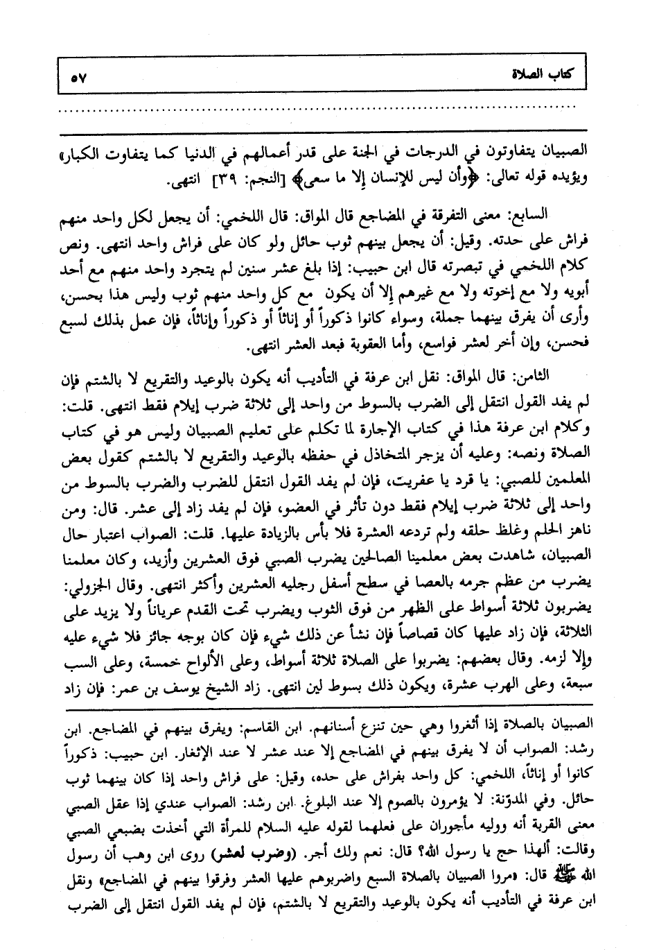 السابع معنى التفرقة في المضاجع قال المواق قال اللخمي أن يجعل لكل واحد منهم فراش على حدته وقيل: أن يجعل بينهم ثوب حائل ولو كان على فراش واحد انتهى ونص كلام اللخمي في تبصرته قال ابن حبيب إذا بلغ عشر سنين لم يتجرد واحد منهم مع أحد أبويه ولا مع إخوته ولا مع غيرهم إلا أن يكون مع كل واحد منهم ثوب وليس هذا بحسن وأرى أن يفرق بينهما جملة وسواء كانوا ذكورا أو إناثا أو ذكورا وإناثا فإن عمل بذلك لسبع فحسن وإن أخر لعشر فواسع وأما العقوبة فبعد العشر انتهى.