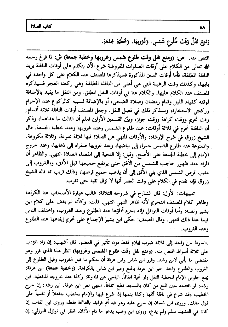 ص: ومنع نفل وقت طلوع شمس وغروبها وخطبة جمعة. ش: لما فرغ رحمه الله تعالى من الكلام على أوقات الصلوات المفروضة شرع الآن يتكلم على أوقات النافلة يريد النافلة المطلقة فأما أوقات السنن المذكورة فسيذكرها المصنف عند الكلام على كل واحد في بابها وكذلك وقت الرغيبة التي هي أعلى من النافلة المطلقة وهي ركعتا الفجر فسيذكره المصنف عند الكلام عليها والكلام هنا في أوقات النفل المطلق ومن النفل ما يقيد بالإضافة لوقته كقيام الليل وقيام رمضان وصلاة الضحى أو بالإضافة لسببه كالركوع عند الإحرام وركعتي الاستخارة وسنذكر ذلك في فصل: النفل وجعل المصنف أوقات النافلة ثلاثة أقسام وقت تحريم ووقت كراهة ووقت جواز وبين القسمين الأولين فعلم أن الثالث ما عداهما وذكر أن النافلة تحرم في ثلاثة أوقات عند طلوع الشمس وعند غروبها وعند خطبة الجمعة قال الشيخ زروق في شرح الإرشاد والأوقات المنهي عن الصلاة فيها ثلاثة ممنوعة وثلاثة مكروهة والممنوعة عند طلوع الشمس حمراء إلى بياضها وعند غروبها صفراء إلى ذهابها وعند خروج الإمام إلى خطبة الجمعة على الأصح وقيل: إلا التحية إلى انقضاء الصلاة انتهى والظاهر أن المراد عند ظهور حاجب الشمس من الأفق حتى يرتفع جميعها قبل الأفق وبالغروب إلى مغيب قرص الشمس الذي يلي الأفق إلى أن يذهب جميع قرصها وذلك قريب مما قاله الشيخ زروق فإنه تقدم في الكلام على وقت العصر أنها لا تزال نقية حتى تغرب .