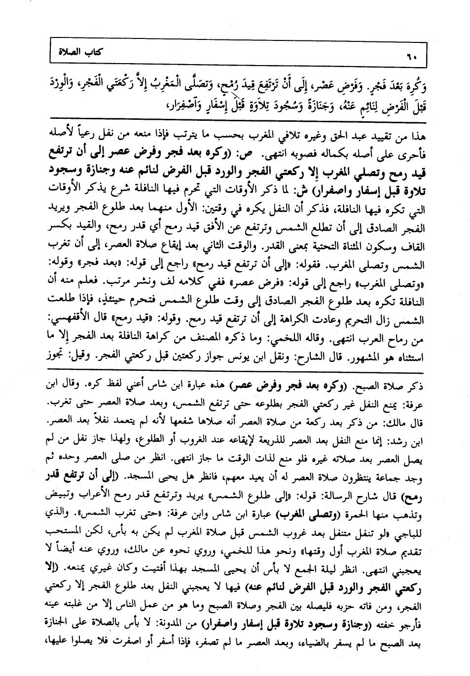 وكره بعد فجر وفرض عصر إلى أن ترتفع قيد رمح وتصلى المغرب إلا ركعتي الفجر والورد قبل الفرض لنائم عنه وجنازة وسجود تلاوة قبل إسفار واصفرار