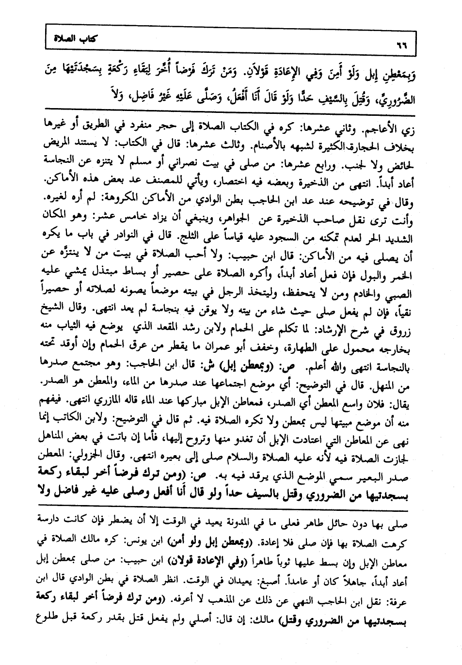 وبمعطن إبل ولو أمن وفي الإعادة قولان ومن ترك فرضا أخر لبقاء ركعة بسجدتيها من الضروري وقتل بالسيف حدا ولو قال أنا أفعل وصلى عليه غير فاضل ولا