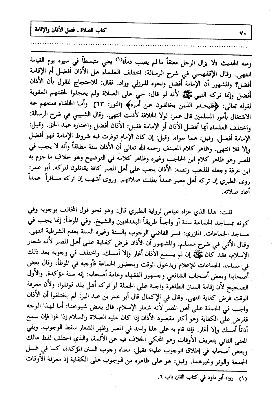 ومنه الحديث لا يزال الرجل معنقا ما لم يصب دما(1) يعني متبسطا في سيره يوم القيامة انتهى وقال الأقفهسي في شرح الرسالة اختلف العلماء هل الأذان أفضل أم الإقامة أفضل والمشهور أن الإمامة أفضل ونحوه للبرزلي وزاد فقال للاحتجاج للقول بأن الأذان أفضل وإنما تركه النبي صلى الله عليه وسلم عليه لأنه لو قال حي على الصلاة ولم يعجلوا لحقتهم العقوبة لقوله: تعالى: {فَلْيَحْذَرِ الَّذِينَ يُخَالِفُونَ عَنْ أَمْرِهِ} (النور: من الآية63) وأما الخلفاء فمنعهم عنه الاشتغال بأمور المسلمين قال عمر لولا الخلافة لأذنت انتهى وقال الشبيبي في شرح الرسالة واختلف العلماء أيما أفضل الأذان أو الإمامة فقيل: الأذان أفضل واختاره عبد الحق وقيل: الإمامة أفضل وقيل: هما سواء وقيل: إن كان الإمام توفرت فيه شروط الإمامة فهو أفضل وإلا فلا انتهى وظاهر كلام المصنف رحمه الله تعالى أن الأذان سنة مطلقا وأنه لا يجب في المصر وهو ظاهر كلام ابن الحاجب وغيره وظاهر كلامه في التوضيح وهو خلاف ما جزم به ابن عرفة وجعله المذهب ونصه الأذان يجب على أهل المصر كافة يقاتلون لتركه أبو عمر روى الطبري إن تركه أهل مصر عمدا بطلت صلاتهم وروى أشهب إن تركه مسافرا عمدا أعاد صلاته.
