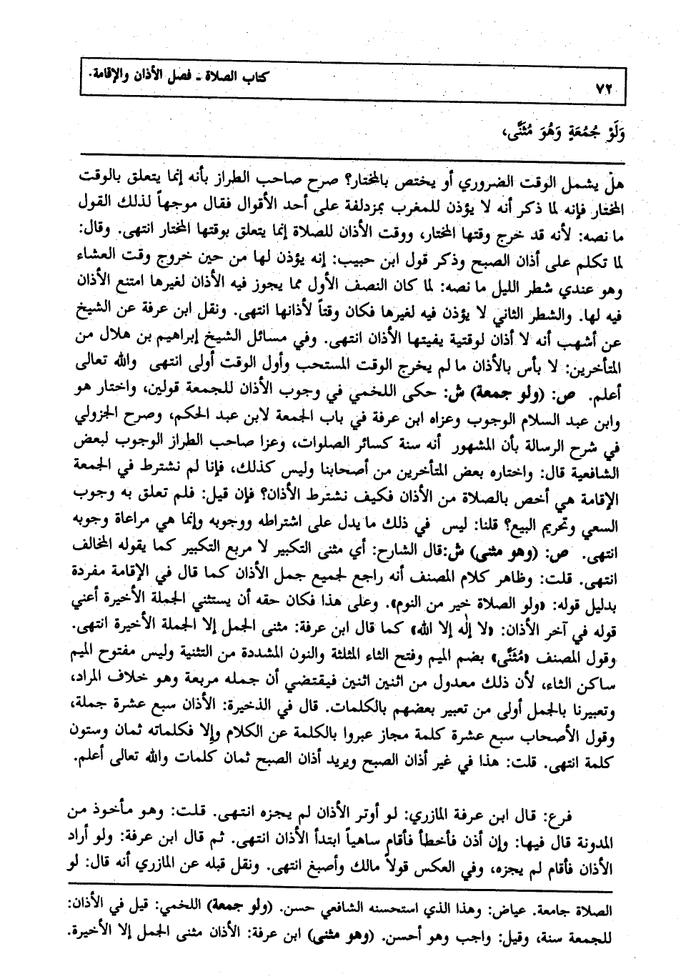 هل يشمل الوقت الضروري أو يختص بالمختار صرح صاحب الطراز بأنه إنما يتعلق بالوقت المختار فإنه لما ذكر أنه لا يؤذن للمغرب بمزدلفة على أحد الأقوال فقال موجها لذلك القول ما نصه لأنه قد خرج وقتها المختار ووقت الأذان للصلاة إنما يتعلق بوقتها المختار انتهى وقال لما تكلم على أذان الصبح وذكر قول ابن حبيب إنه يؤذن لها من حين خروج وقت العشاء وهو عندي شطر الليل ما نصه لما كان النصف الأول مما يجوز فيه الأذان لغيرها امتنع الأذان فيه لها والشطر الثاني لا يؤذن فيه لغيرها فكان وقتا لأذانها انتهى ونقل ابن عرفة عن الشيخ عن أشهب أنه لا أذان لوقتية يفيتها الأذان انتهى وفي مسائل الشيخ إبراهيم بن هلال من المتأخرين لا بأس بالأذان ما لم يخرج الوقت المستحب وأول الوقت أولى انتهى والله تعالى أعلم ص: ولو جمعة ش: حكى اللخمي في وجوب الأذان للجمعة قولين واختار هو وابن عبد السلام الوجوب وعزاه ابن عرفة في باب الجمعة لابن عبد الحكم وصرح الجزولي في شرح الرسالة بأن المشهور أنه سنة كسائر الصلوات وعزا صاحب الطراز الوجوب لبعض الشافعية قال واختاره بعض المتأخرين من أصحابنا وليس كذلك فإنا لم نشترط في الجمعة الإقامة هي أخص بالصلاة من الأذان فكيف نشترط الأذان فإن قيل: فلم تعلق به وجوب السعي وتحريم البيع قلنا ليس في ذلك ما يدل على اشتراطه ووجوبه وإنما هي مراعاة وجوبه انتهى ص: وهو مثنى ش: قال الشارح أي مثنى التكبير لا مربع التكبير كما يقوله: المخالف انتهى قلت: وظاهر كلام المصنف أنه راجع لجميع جمل الأذان كما قال في الإقامة مفردة بدليل قوله: ولو الصلاة خير من النوم وعلى هذا فكان حقه أن يستثني الجملة الأخيرة أعني قوله: في آخر الأذان لا إله إلا الله كما قال ابن عرفة مثنى الجمل إلا الجملة الأخيرة انتهى وقول المصنف مثنى بضم الميم وفتح الثاء المثلثة والنون المشددة من التثنية وليس مفتوح الميم ساكن الثاء لأن ذلك معدول من اثنين اثنين فيقتضي أن جمله مربعة وهو خلاف المراد وتعبيرنا بالجمل أولى من تعبير بعضهم بالكلمات قال في الذخيرة الأذان سبع عشرة جملة وقول الأصحاب سبع عشرة كلمة مجاز عبروا بالكلمة عن الكلام وإلا فكلماته ثمان وستون كلمة انتهى قلت: هذا في غير أذان الصبح ويريد أذان الصبح ثمان كلمات والله تعالى أعلم.