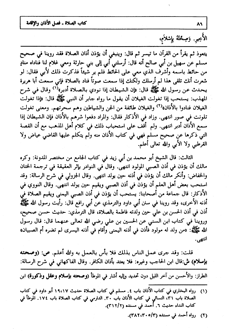 ص: وصحته بإسلام ش: قال ابن الحاجب وغيره فلا يعتد بأذان الكافر وقال الفاكهاني في شرح الرسالة