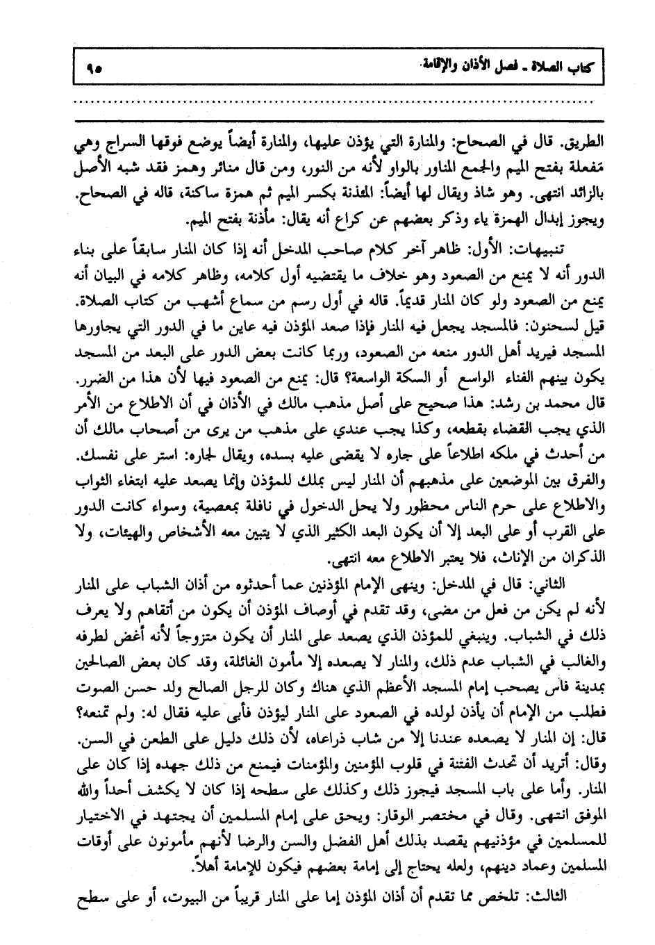 تنبيهات: الأول: ظاهر آخر كلام صاحب المدخل أنه إذا كان المنار سابقا على بناء الدور أنه لا يمنع من الصعود وهو خلاف ما يقتضيه أول كلامه وظاهر كلامه في البيان أنه يمنع من الصعود ولو كان المنار قديما قاله في أول رسم من سماع أشهب من كتاب الصلاة قيل: لسحنون فالمسجد يجعل فيه المنار فإذا صعد المؤذن فيه عاين ما في الدور التي يجاورها المسجد فيريد أهل الدور منعه من الصعود وربما كانت بعض الدور على البعد من المسجد يكون بينهم الفناء الواسع أو السكة الواسعة قال يمنع من الصعود فيها لأن هذا من الضرر قال محمد بن رشد هذا صحيح على أصل مذهب مالك في الأذان في أن الاطلاع من الأمر الذي يجب القضاء بقطعه وكذا يجب عندي على مذهب من يرى من أصحاب مالك أن من أحدث في ملكه اطلاعا على جاره لا يقضى عليه بسده ويقال لجاره استر على نفسك والفرق بين الموضعين على مذهبهم أن المنار ليس بملك للمؤذن وإنما يصعد عليه ابتغاء الثواب والاطلاع على حرم الناس محظور ولا يحل الدخول في نافلة بمعصية وسواء كانت الدور على القرب أو على البعد إلا أن يكون البعد الكثير الذي لا يتبين معه الأشخاص والهيآت ولا الذكران من الإناث فلا يعتبر الاطلاع معه انتهى.