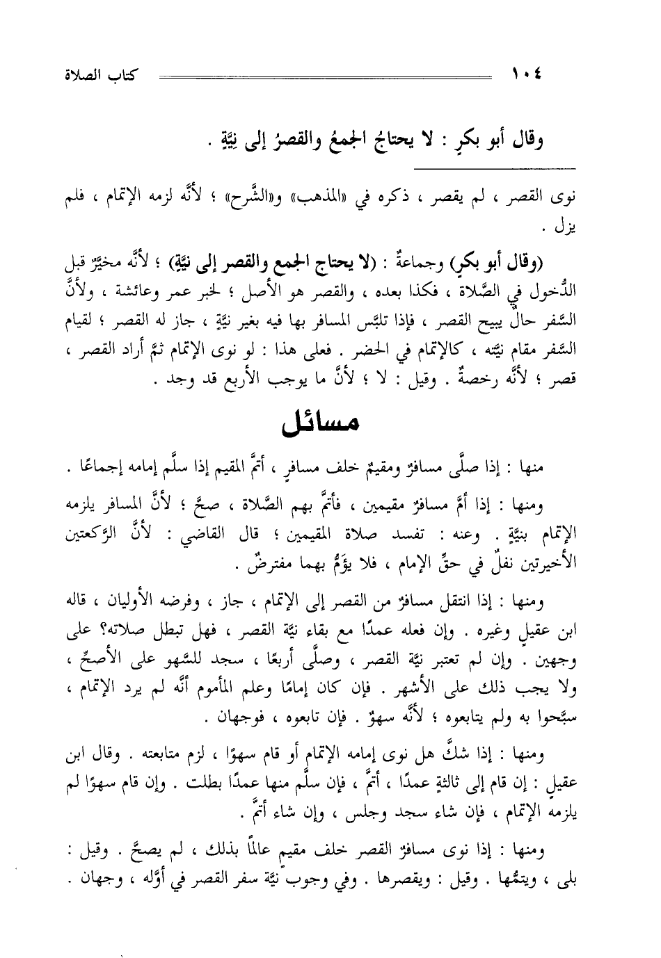 "وقال أبو بكر" وجماعة "لا يحتاج الجمع والقصر إلى نية" لأنه مخير قبل الدخول في الصلاة فكذا بعده والقصر هو الأصل لخبر عمر وعائشة ولأن السفر حال يبيح القصر فإذا تلبس المسافر بها فيه بغير نية جاز له القصر لقيام السفر مقام نيته كالإتمام في الحضر فعلى هذا لو نوى الإتمام ثم أراد القصر قصر لأنه رخصة وقيل لا لأن ما يوجب الأربع قد وجد.