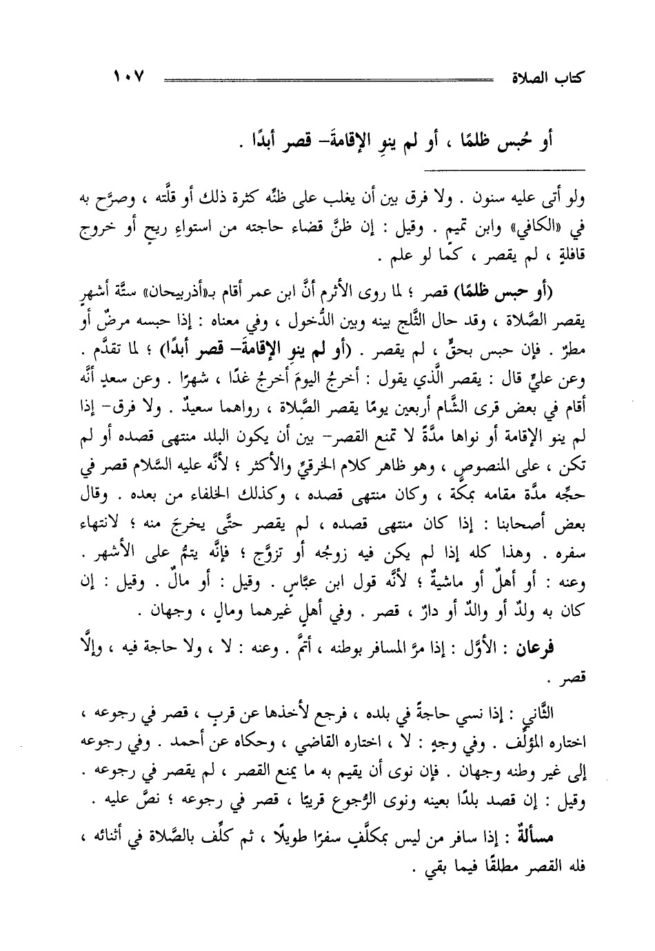"أو حبس ظلما" قصر لما روى الأثرم أن ابن عمر أقام بأذربيحان ستة أشهر يقصر الصلاة وقد حال الثلج بينه وبين الدخول وفي معناه إذا حبسه مرض أو مطر فإن حبس بحق لم يقصر "أو لم ينو الإقامة قصر أبدا" لما تقدم وعن علي قال يقصر الذي يقول أخرج اليوم أخرج غدا شهرا وعن سعد أنه أقام في بعض قرى الشام أربعين يوما يقصر الصلاة رواهما سعيد ولا فرق إذا لم ينو الإقامة أو نواها مدة لا تمنع القصر بين أن يكون البلد منتهى قصده أو لم تكن على المنصوص وهو ظاهر كلام الخرقي والأكثر لأنه عليه السلام قصر في حجه مدة مقامه بمكة وكان منتهى قصده وكذلك الخلفاء من بعده وقال بعض أصحابنا إذا كان منتهى قصده لم يقصر حتى يخرج منه لانتهاء سفره وهذا كله إذا لم يكن فيه زوجه أو تزوج فإنه يتم على الأشهر وعنه أو أهل أو ماشية لأنه قول ابن عباس وقيل أو مال وقيل إن كان به ولد أو والد أو دار قصر وفي أهل غيرهما ومال وجهان