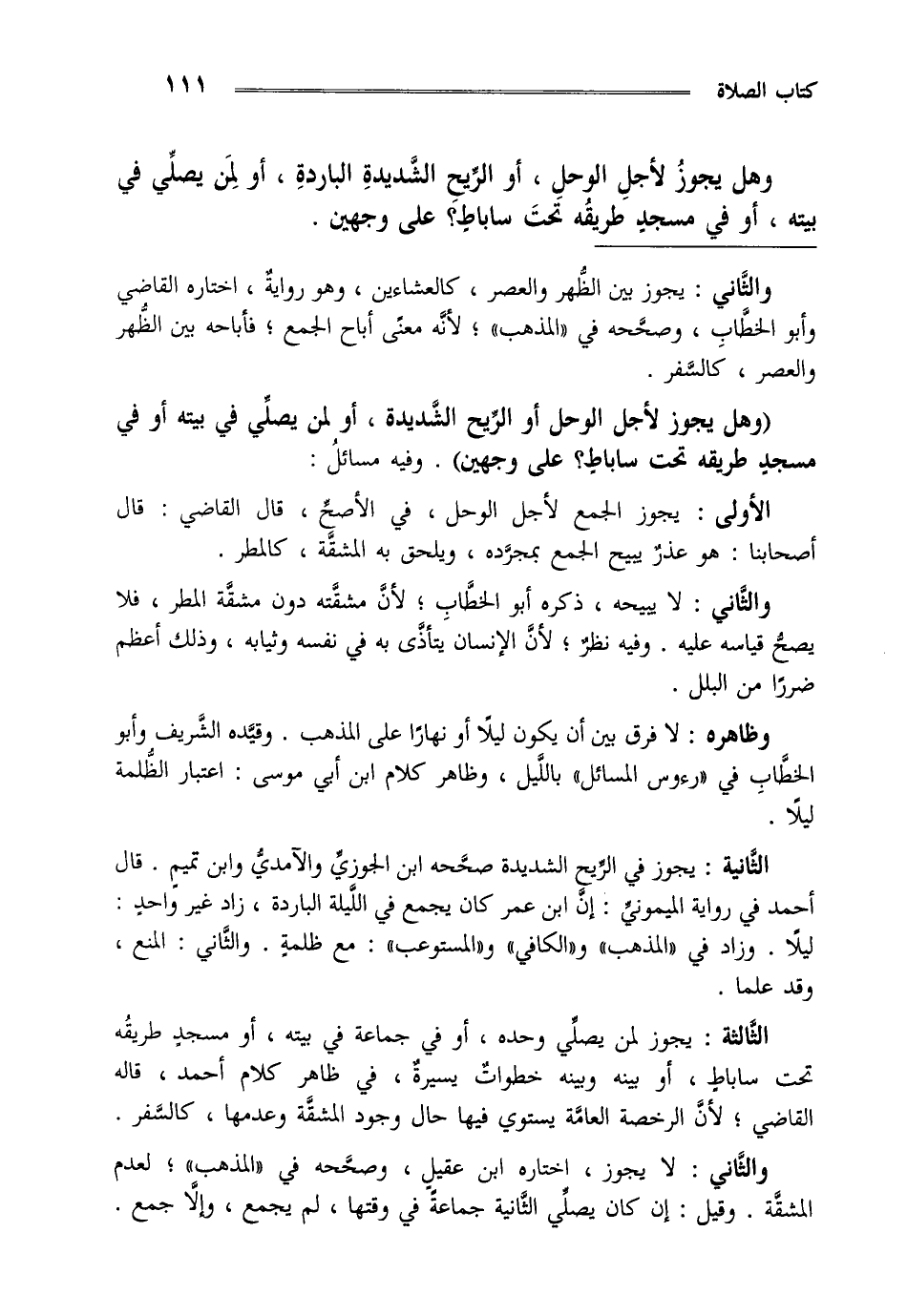 الثانية: يجوز في الريح الشديدة صححه ابن الجوزي والآمدي وابن تميم قال أحمد في رواية الميموني إن ابن عمر كان يجمع في الليلة الباردة واحد ليلا وزاد في المذهب والكافي والمستوعب مع ظلمة والثاني المنع وقد علما.