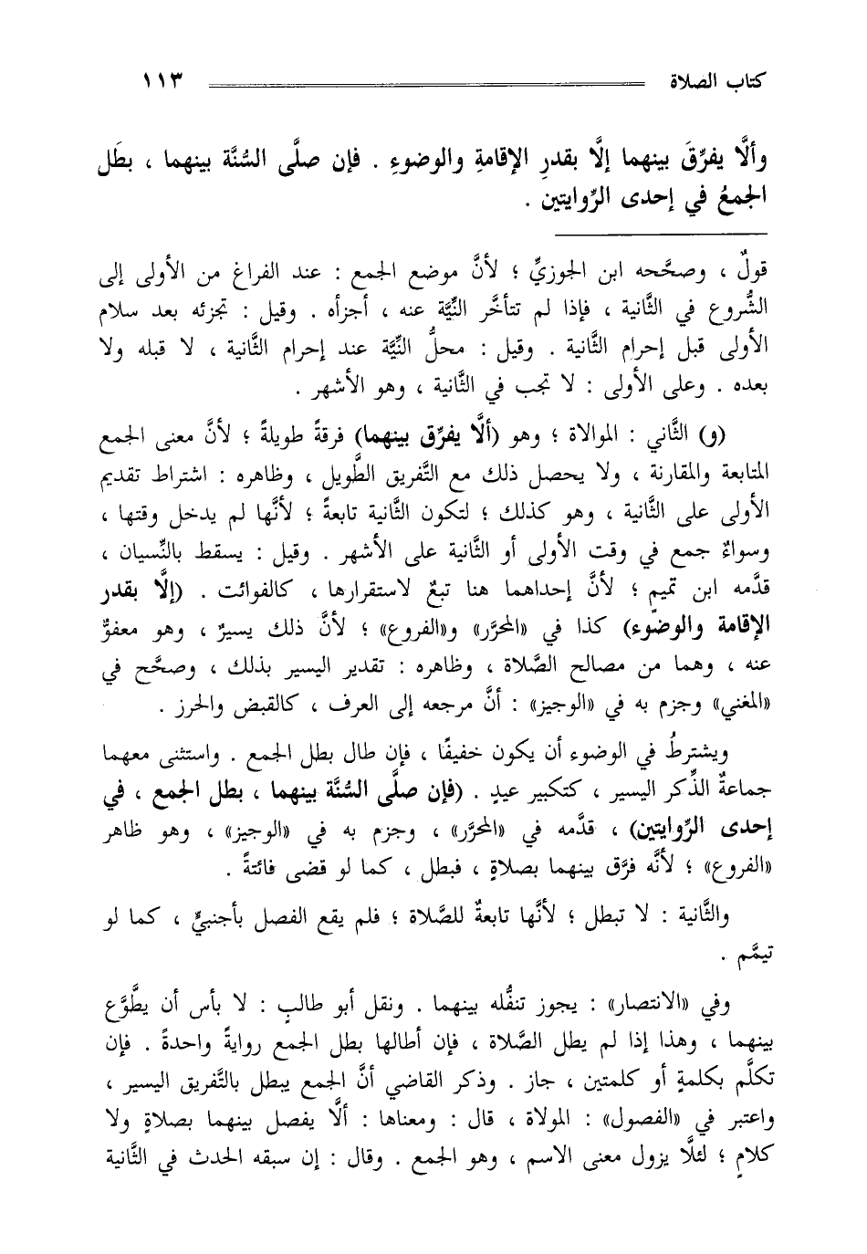 ويشترط في الوضوء أن يكون خفيفا فإن طال بطل الجمع واستثنى معها جماعة الذكر اليسير كتكبير عيد "فإن صلى السنة بينهما بطل الجمع في إحدى الروايتين" قدمه في المحرر وجزم به في الوجيز وهو ظاهر الفروع لأنه فرق بينهما بصلاة فبطل كما لو قضى فائتة.
