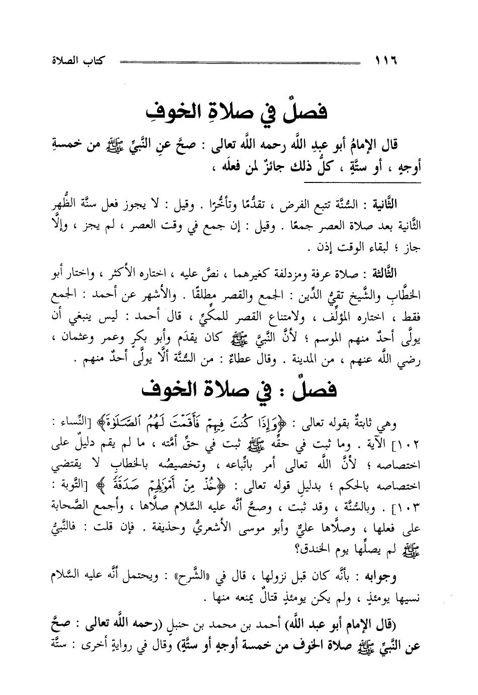 " قال الإمام أبو عبد الله" أحمد بن محمد بن حنبل "رحمه الله تعالى صح عن النبي صلى الله عليه وسلم صلاة الخوف من خمسة أوجه أو ستة" وقال في رواية أخرى ستة