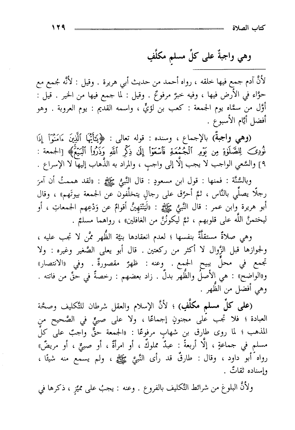 "على كل مسلم مكلف" لأن الإسلام والعقل شرطان للتكليف وصحة العباد فلا تجب على مجنون إجماعا ولا على صبي في الصحيح من المذهب لما روى طارق بن شهاب مرفوعا "الجمعة حق واجب على كل مسلم في جماعة إلا أربعة عبد مملوك أو امرأة أو صبي أو مريض" رواه أبو داود وقال طارق قد رأى النبي صلى الله عليه وسلم ولم يسمع منه شيئا وإسناده ثقات.
