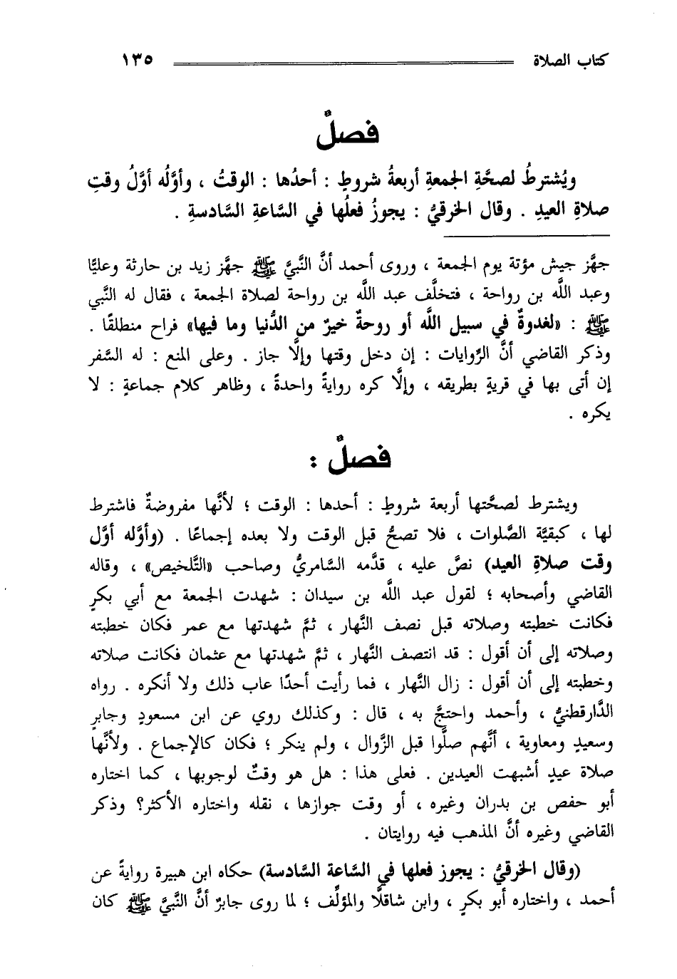 ويشترط لصحة الجمعة أربعة شروط أحدها: الوقت وأوله أول وقت صلاة العيد وقال الخرقي يجوز فعلها في الساعة السادسة.