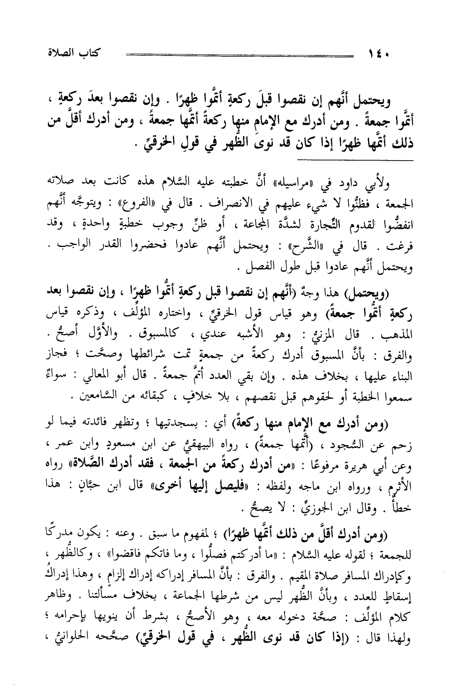 ويحتمل أنهم إن نقصوا قبل ركعة أتموا ظهرا وإن نقصوا بعد ركعة أتموا جمعة ومن أدرك مع الإمام منها ركعة أتمها جمعة ومن أدرك أقل من ذلك أتمها ظهرا إذا كان قد نوى الظهر في قول الخرقي.
