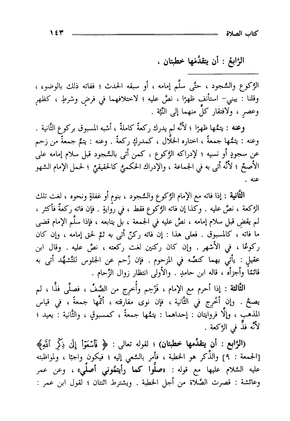 الثانية: إذا فاته مع الإمام الركوع والسجود بنوم أو غفلة ونحوه لغت تلك الركعة نص عليه وكذا إن فاته الركوع فقط في رواية فإن فاته ركعة فأكثر لم يقض قبل سلام إمامه نص عليه في الجمعة بل يتابعه فإذا سلم الإمام قضى ما فاته كالمسبوق فعلى هذا إن فاته ركن أتى به ثم لحق إمامه وإن كان ركوعا في الأشهر وإن كان ركنين لغت ركعته نص عليه وقال ابن عقيل يأتي بهما كنصه في المزحوم فإن زحم عن الجلوس للتشهد أتى به قائما وأجزأه قاله ابن حامد والأولى انتظار زوال الزحام.