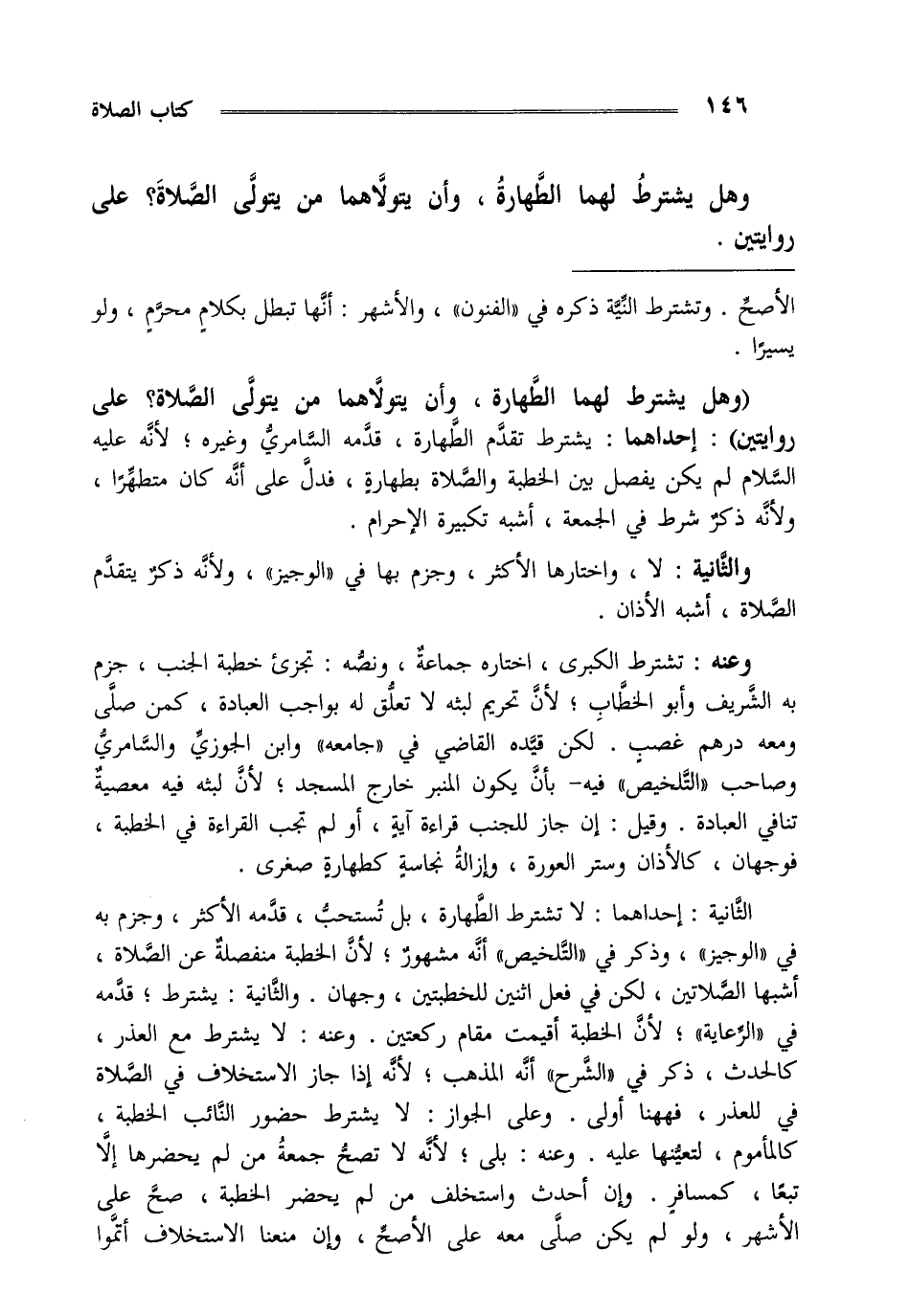 الثانية: إحداهما لا تشترط الطهارة بل تستحب قدمه الأكثر وجزم به في الوجيز وذكر في التلخيص أنه مشهور لأن الخطبة منفصل:ة عن الصلاة أشبها الصلاتين لكن في فعل اثنين للخطبتين وجهان والثانية يشترط قدمه في الرعاية لأن الخطبة أقيمت مقام ركعتين وعنه لا يشترط مع العذر كالحدث ذكر في الشرح أنه المذهب لأنه إذا جاز الاستخلاف في الصلاة للعذر فهاهنا أولى وعلى الجواز لا يشترط حضور النائب الخطبة كالمأموم لتعينها عليه وعنه بلى لأنه لا تصح جمعة من لم يحضرها إلا تبعا كمسافر وإن أحدث واستخلف من لم يحضر الخطبة صح على الأشهر ولو لم يكن صلى معه على الأصح وإن منعنا الاستخلاف أتموا