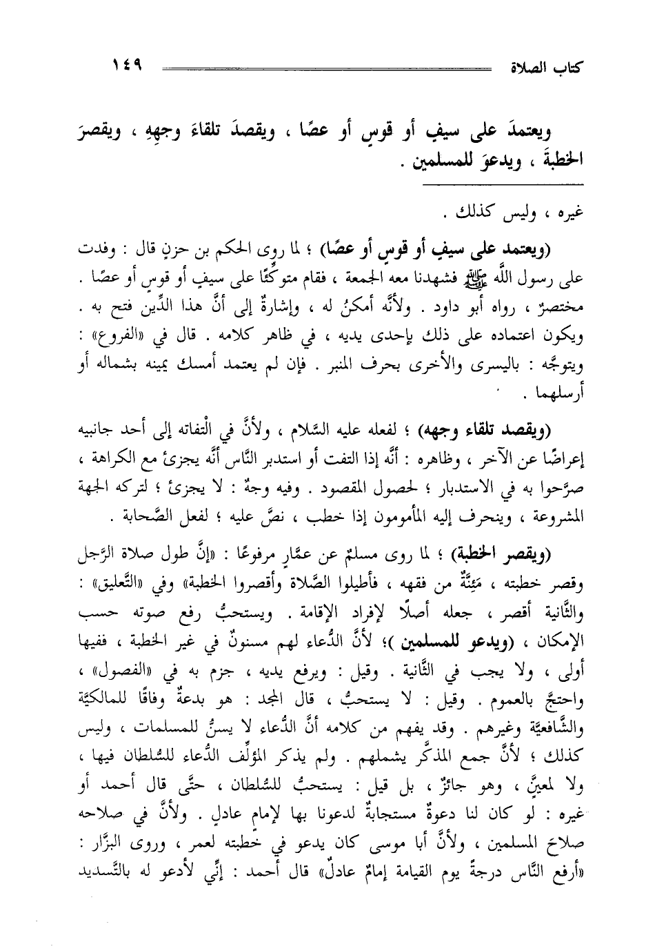 ويعتمد على سيف أو قوس أو عصا ويقصد تلقاء وجهه ويقصر الخطبة ويدعو للمسلمين.