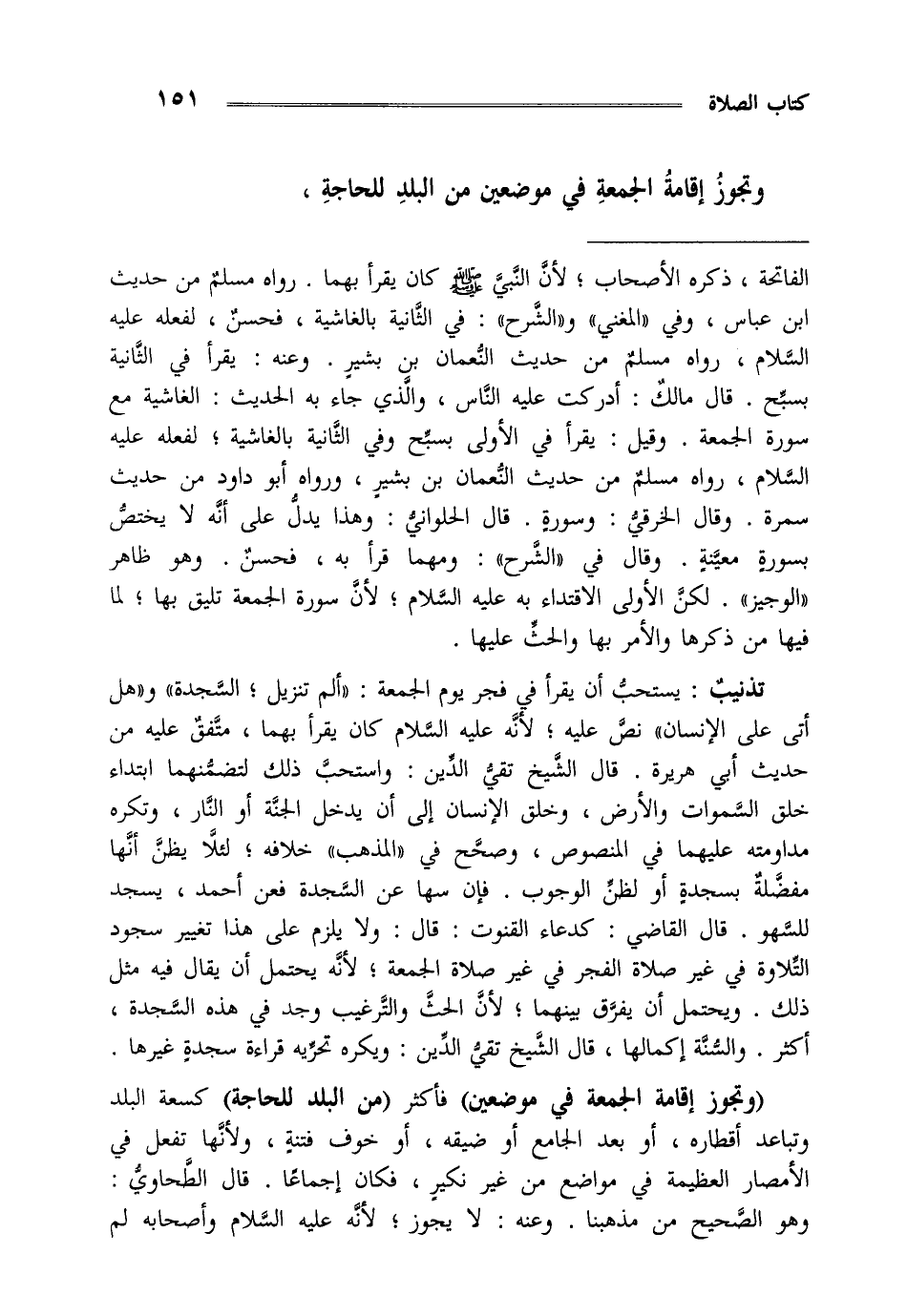 وتجوز إقامة الجمعة في موضعين من البلد للحاجة.