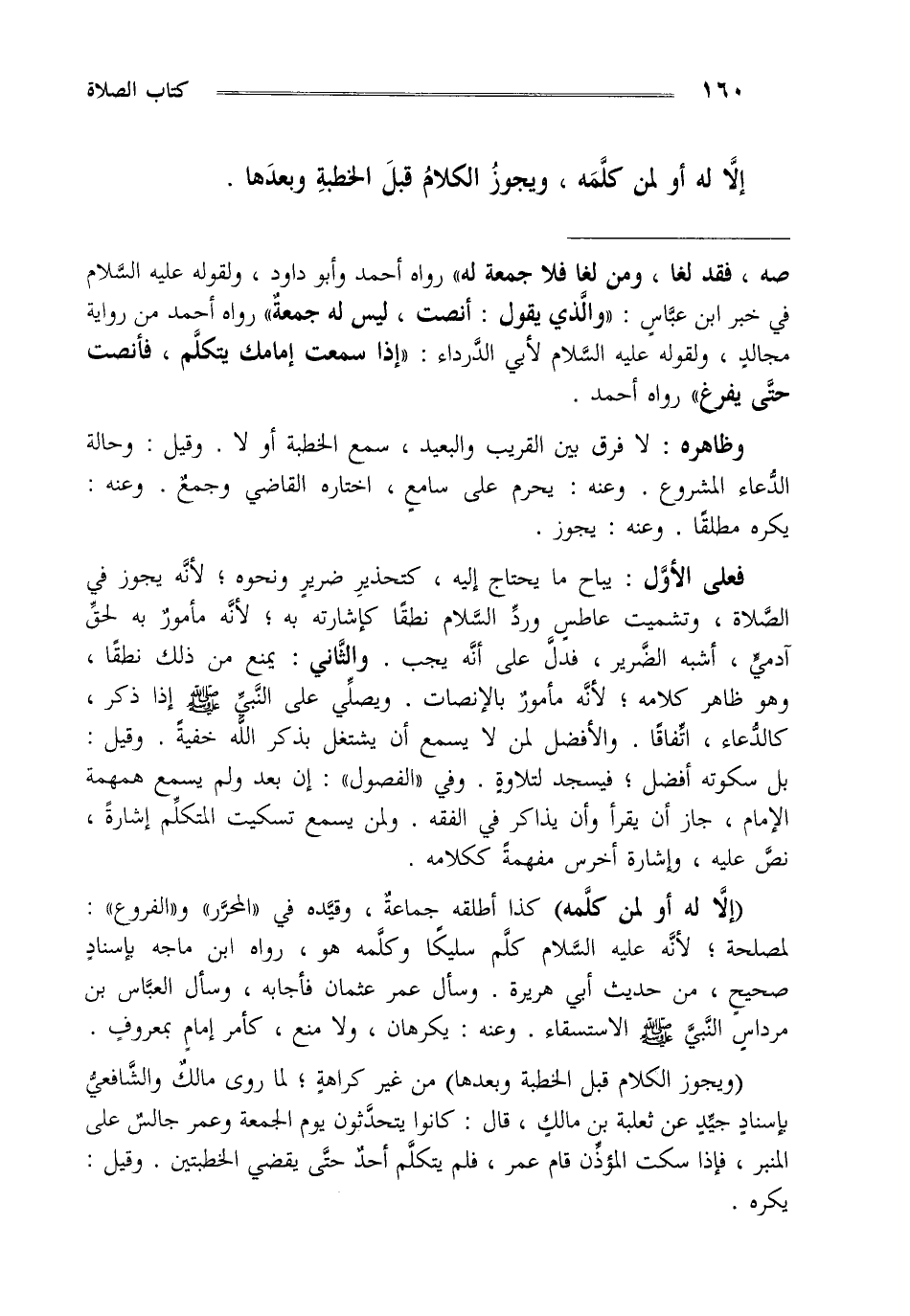 "إلا له أو لمن كلمه" كذا أطلقه جماعة وقيده في المحرر والفروع لمصلحة لأنه عليه السلام كلم سليكا وكلمه هو رواه ابن ماجه بإسناد صحيح من حديث أبي هريرة وسأل عمر عثمان فأجابه وسأل العباس بن مرداس النبي صلى الله عليه وسلم الاستسقاء وعنه يكرهان ولا منع كأمر إمام بمعروف.