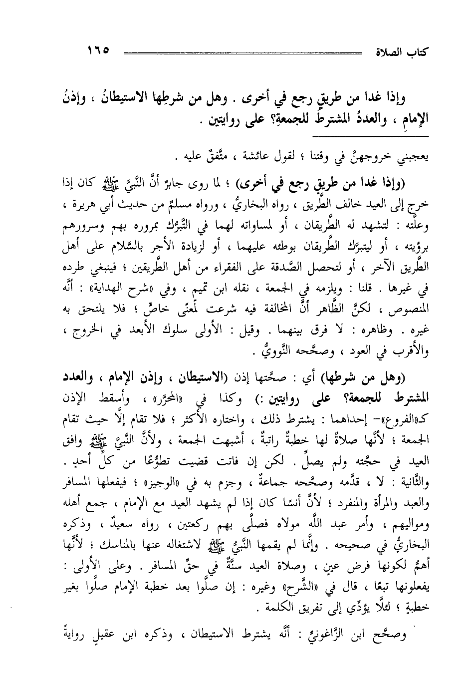 "وإذا غدا عن طريق رجع في أخرى" لما روى جابر أن النبي صلى الله عليه وسلم كان إذا خرج إلى العيد خالف الطريق رواه البخاري ورواه مسلم من حديث أبي هريرة وعلته لتشهد له الطريقان أو لمساواته لهما في التبرك بمروره بهم وسرورهم برؤيته أو ليتبرك الطريقان بوطئه عليهما أو لزيادة الأجر بالسلام على أهل الطريق الآخر أو لتحصل الصدقة على الفقراء من أهل الطريقين فينبغي طرده في غيرها قلنا ويلزمه في الجمعة نقله ابن تميم وفي شرح الهداية أنه المنصوص لكن الظاهر أن المخالفة فيه شرعت لمعنى خاص فلا يلتحق به غيره وظاهره لا فرق بينهما وقيل الأولى سلوك الأبعد في الخروج والأقرب في العود وصححه النووي