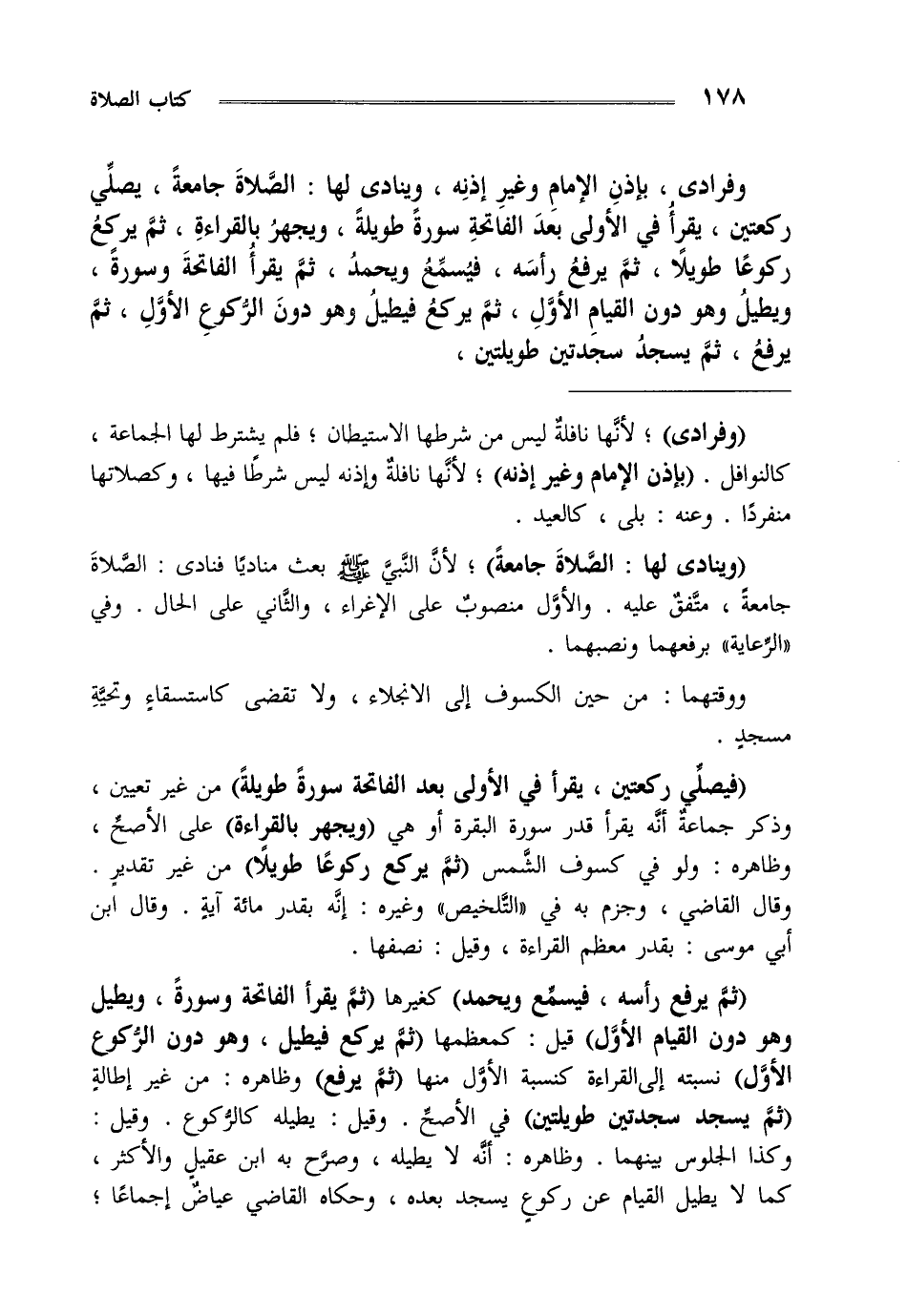 وفرادى بإذن الإمام وغير إذنه وينادى لها الصلاة جامعة يصلي ركعتين يقرأ في الأولى بعد الفاتحة سورة طويلة ويجهر بالقراءة ثم يركع ركوعا طويلا ثم يرفع رأسه فيسمع ويحمد ثم يقرأ الفاتحة وسورة ويطيل وهو دون القيام الأول ثم يركع فيطيل وهو دون الركوع الأول ثم يرفع ثم يسجد سجدتين طويلتين ،.