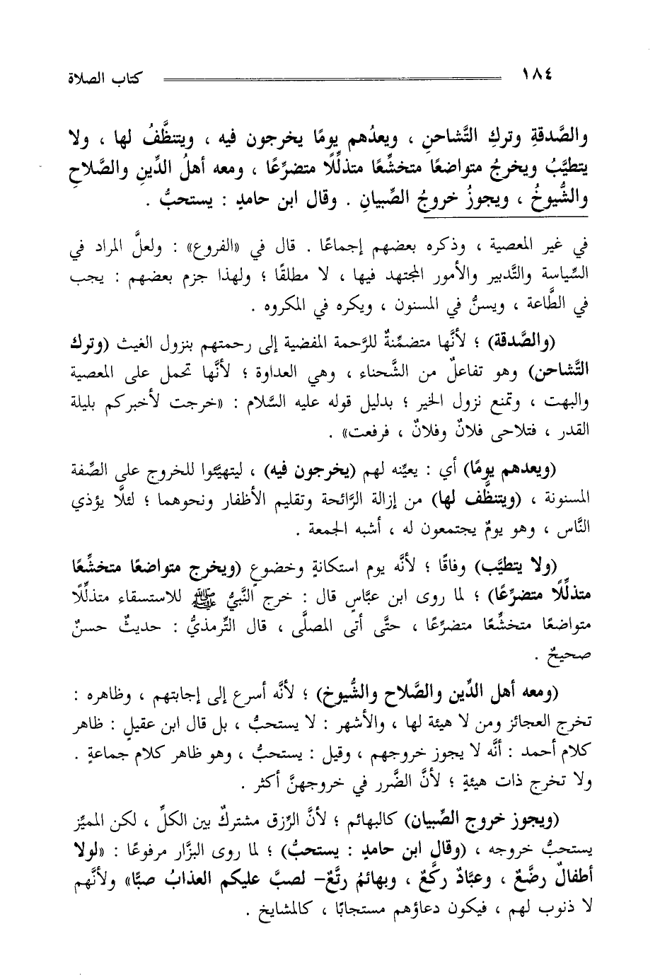 "ويجوز خروج الصبيان" كالبهائم لأن الرزق مشترك بين الكل لكن المميز يستحب خروجه "وقال ابن حامد يستحب" لما روى البزار مرفوعا "لولا أطفال رضع وعباد ركع وبهائم رتع لصب عليكم العذاب صبا" ولأنهم لا ذنوب لهم فيكون دعاؤهم مستجابا كالمشايخ.