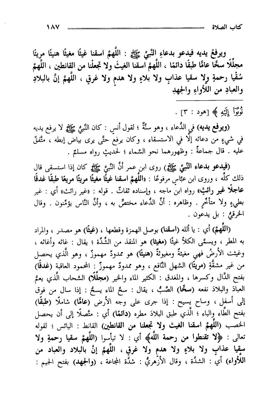 "اللهم" أي يا لله "اسقنا "بوصل الهمزة وقطعها "غيثا" هو مصدر والمراد به المطر ويسمى الكلأ غيثا "مغيثا" هو المنقذ من الشدة يقال غاثه وأغاثه وغيثت الأرض فهي مغيثة ومغيوثة "هنيئا" هو ممدود مهموز وهو الذي يحصل من غير مشقة "مريئا" السهل النافع وهو ممدود مهموز المحمود العاقبة "غدقا" بفتح الدال وكسرها والمغدق الكثير الماء والخير "مجللا" السحاب الذي يعم العباد والبلاد نفعه "سحا" الصب يقال سح الماء يسح إذا سال من فوق إلى أسفل وساح يسيح إذا جرى على وجه الأرض "عاما" شاملا "طبقا" بفتح الطاء والباء الذي طبق البلاد مطره "دائما" أي متصلا إلى أن يحصل الخصب "اللهم اسقنا الغيث ولا تجعلنا من القانطين" القانط اليائس لقوله تعالى {لا تَقْنَطُوا مِنْ رَحْمَةِ اللَّهِ} [الزمر: من الآية53] أي لا تيأسوا "اللهم سقيا رحمة ولا سقيا عذاب ولا بلاء ولا هدم ولا غرق اللهم إن بالبلاد والعباد من اللأواء" أي: الشدة وقال الأزهري شدة المجاعة "والجهد" بفتح الجيم.