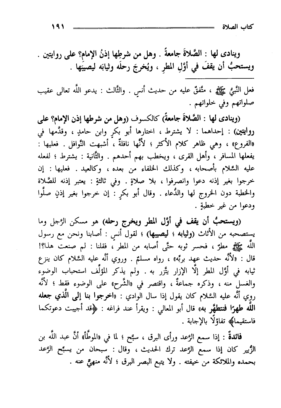 وينادى لها الصلاة جامعة وهل من شرطها إذن الإمام؟ على روايتين ويستحب أن يقف في أول المطر ويخرج رحله وثيابه ليصيبها.