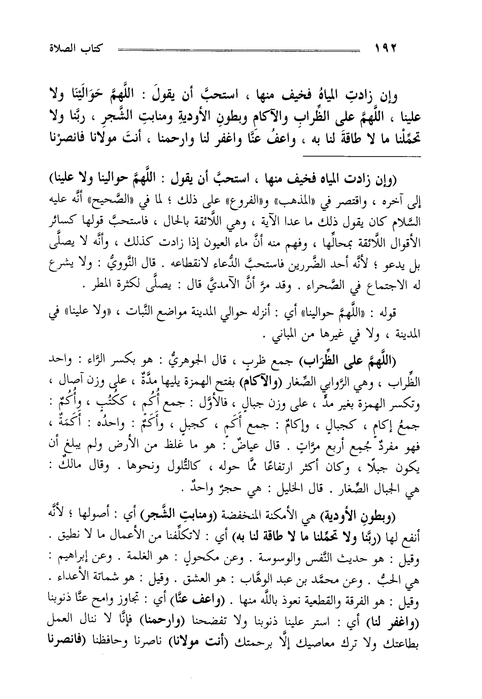 وإن زادت المياه فخيف منها استحب أن يقول اللهم حوالينا ولا علينا اللهم على الظراب والآكام وبطون الأودية ومنابت الشجر ربنا ولا تحملنا ما لا طاقة لنا به واعف عنا واغفر لنا وارحمنا أنت مولانا فانصرنا