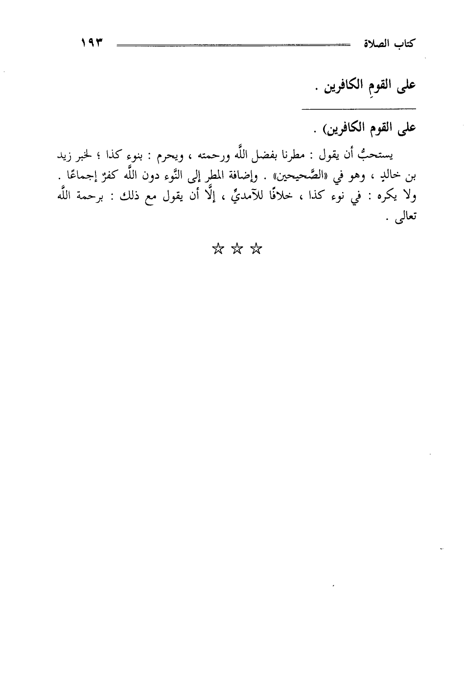يستحب أن يقول مطرنا بفضل الله ورحمته ويحرم بنوء كذا لخبر زيد بن خالد وهو في الصحيحين وإضافة المطر إلى النوء دون الله كفر إجماعا ولا يكره في نوء كذا خلافا للآمدي إلا أن يقول مع ذلك برحمة الله تعالى.