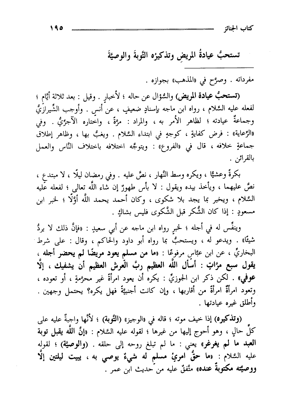 "تستحب عيادة المريض" والسؤال عن حاله لأخبار وقيل بعد ثلاثة أيام لفعله عليه السلام رواه ابن ماجه بإسناد ضعيف عن أنس وأوجب الشيرازي وجماعة عيادته لظاهر الأمر به والمراد مرة واختاره الآجري وفي الرعاية فرض كفاية كوجه في ابتداء السلام ويغب بها وظاهر إطلاق جماعة خلافه قال في الفروع ويتوجه اختلافه باختلاف الناس والعمل بالقرائن