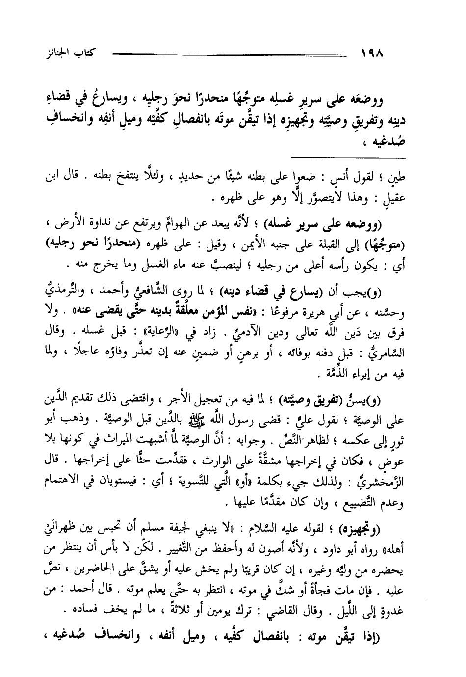 ووضعه على سرير غسله متوجها منحدرا نحو رجليه ويسارع في قضاء دينه وتفريق وصيته وتجهيزه إذا تيقن موته بانفصال كفيه وميل أنفه وانخساف صدغيه ،.