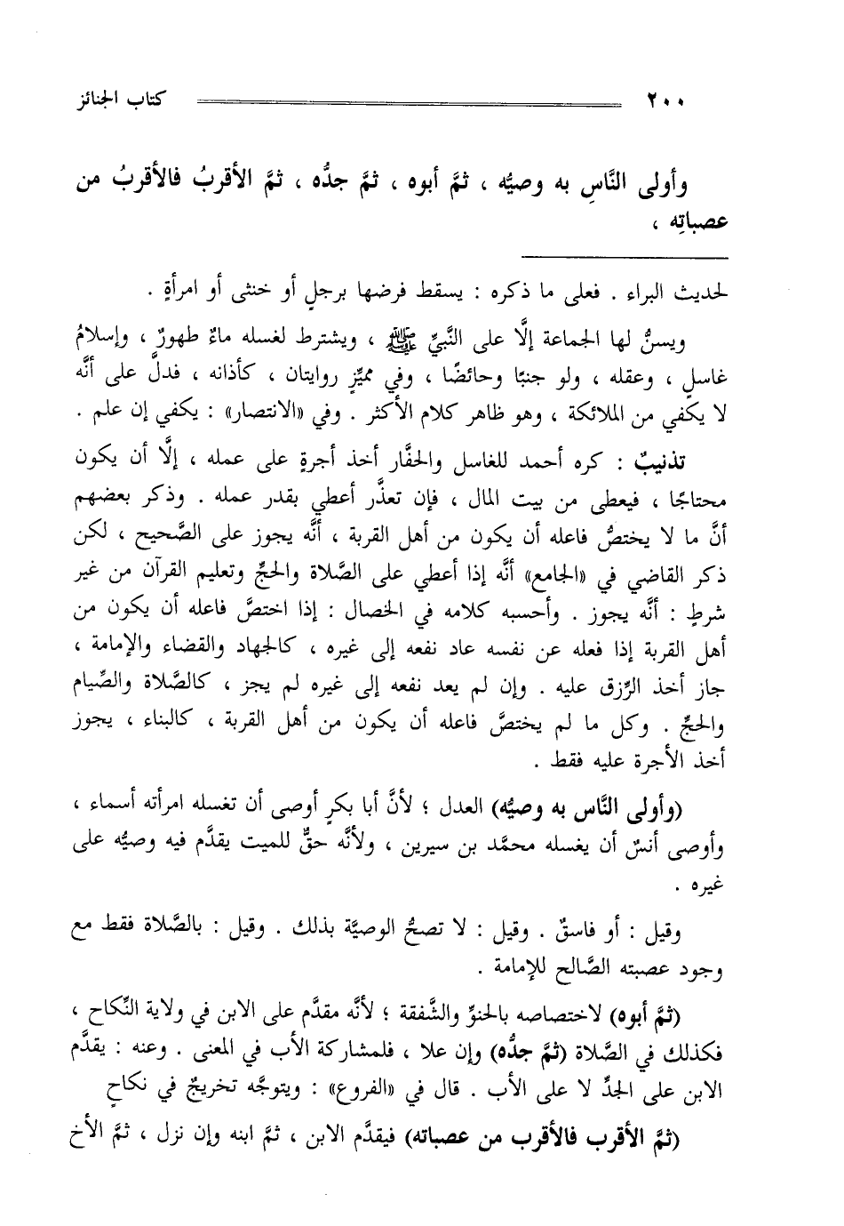 وأولى الناس به وصيه ثم أبوه ثم جده ثم الأقرب فالأقرب من عصباته.