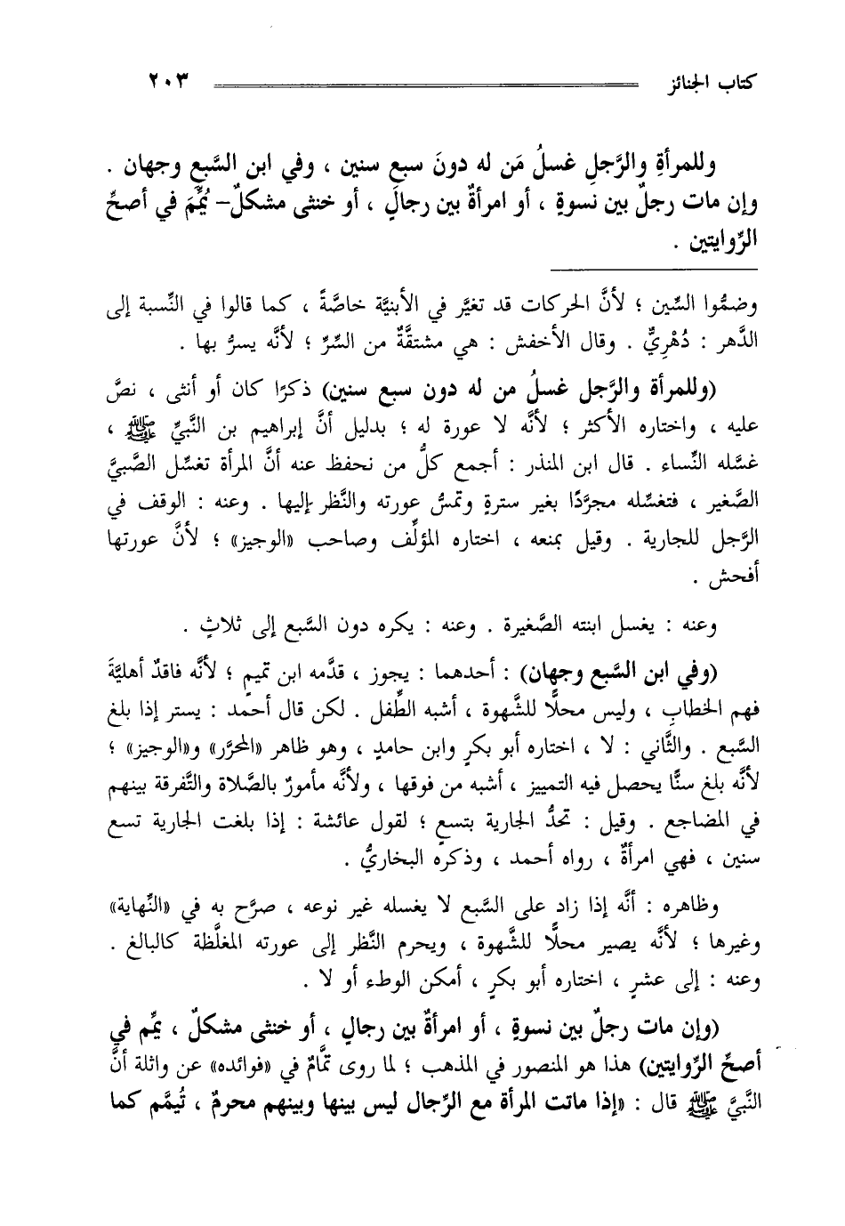وللمرأة والرجل غسل من له دون سبع سنين وفي ابن سبع وجهان ، وإن مات رجل بين نسوة أو امرأة بين رجال أو خنثى مشكل يمم في أصح الروايتين.