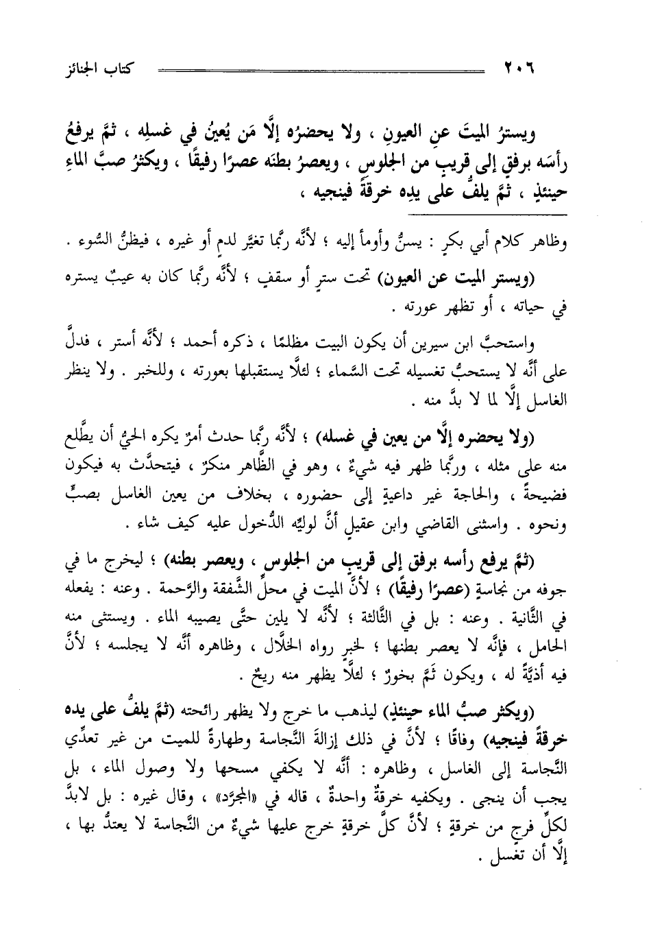 "ثم يرفع إلى قريب من الجلوس ويعصر بطنه" ليخرج ما في جوفه من نجاسة "عصرا رفيقا" لأن الميت في محل الشفقة والرحمة وعنه يفعله في الثانية وعنه بل في الثالثة لأنه لا يلين حتى يصيبه الماء ويستثنى منه الحامل فإنه لا يعصر بطنها لخبر رواه الخلال وظاهره أنه لا يجلسه لأن فيه أذية له ويكون ثم بخور لئلا يظهر منه ريح.