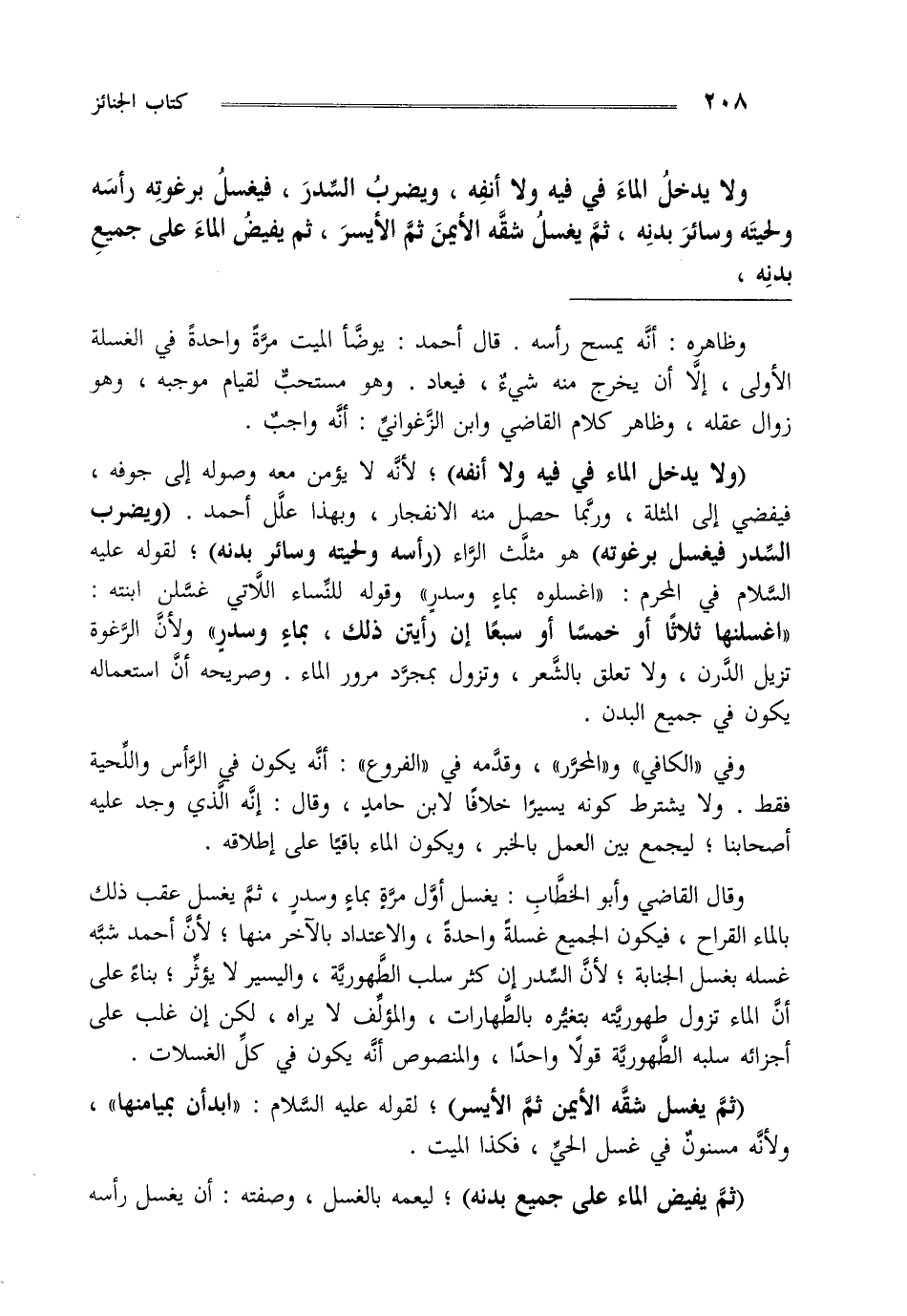 ولا يدخل الماء في فيه ولا أنفه ويضرب الستر ويغسل برغوته رأسه ولحيته وسائر بدنه ثم يغسل شقه الأيمن ثم الأيسر ثم يفيض الماء على جميع بدنه