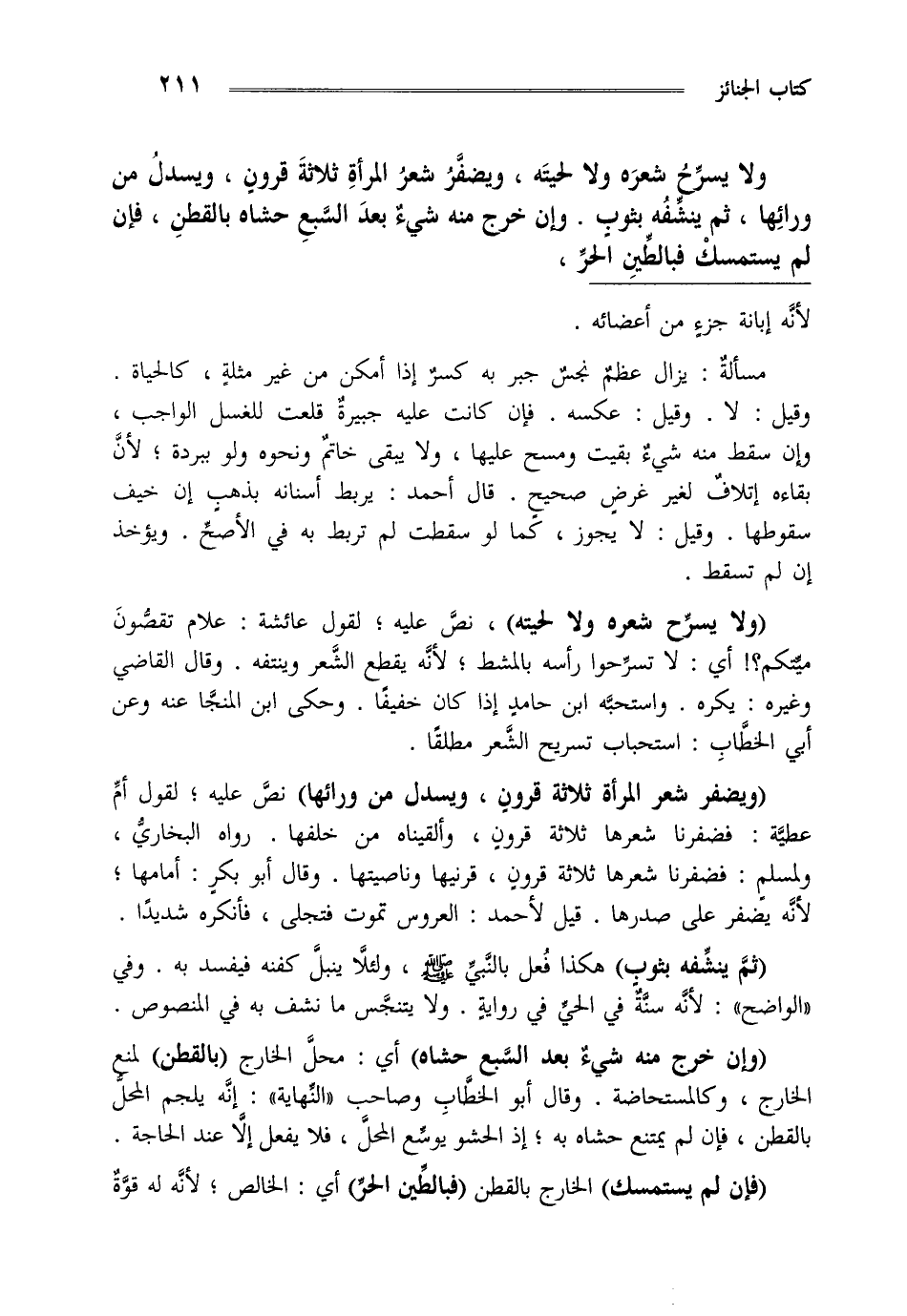 "ولا يسرح شعره ولا لحيته" نص عليه لقول عائشة علام تقصون ميتكم أي لا تسرحوا رأسه بالمشط لأنه يقطع الشعر وينتفه وقال القاضي وغيره يكره واستحبه ابن حامد إذا كان خفيفا وحكى ابن المنجا عنه وعن أبي الخطاب استحباب تسريح الشعر مطلقا.