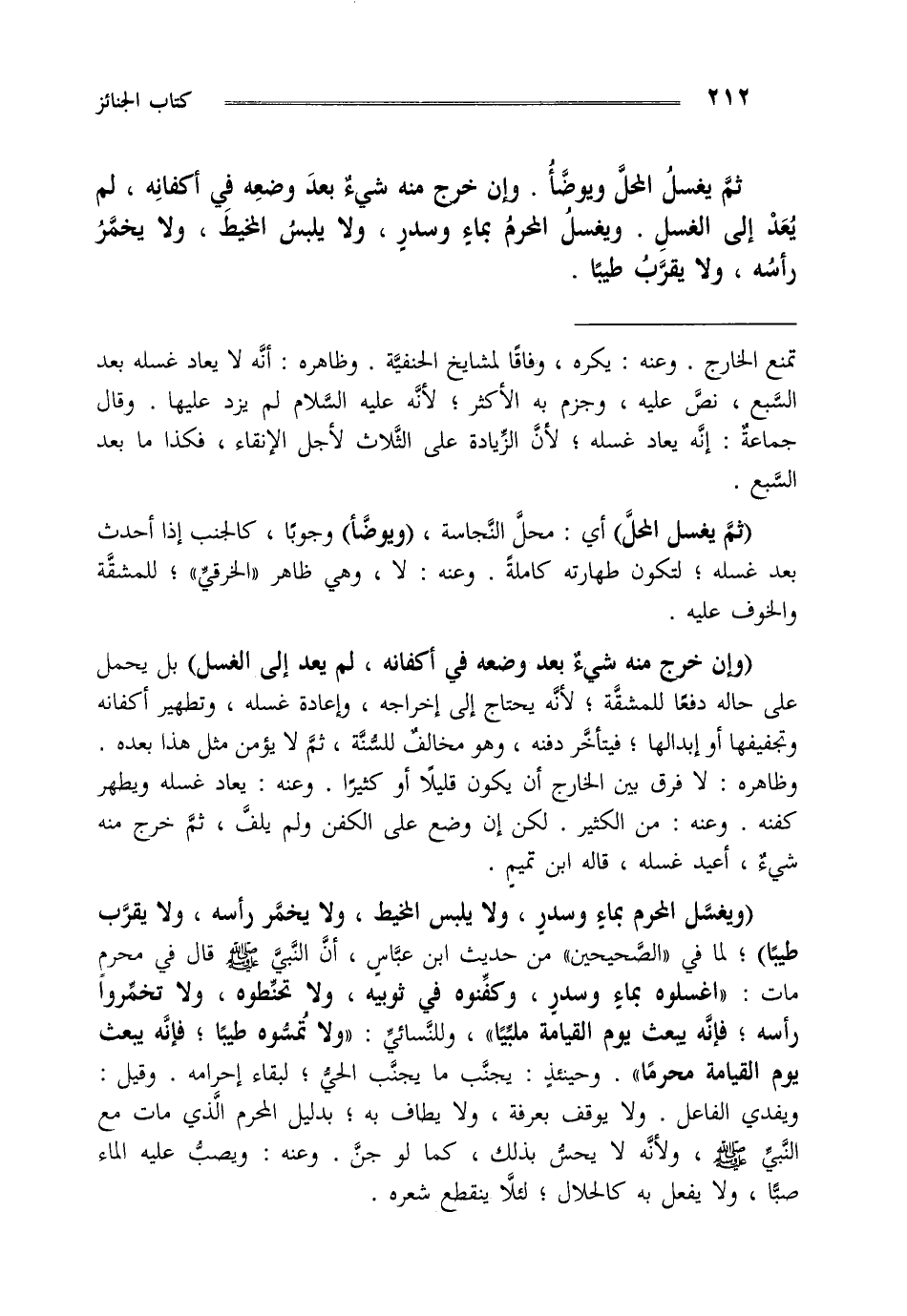 "ويغسل المحرم بماء وسدر ولا يلبس المخيط ولا يخمر رأسه ولا يقرب طيبا" والشهيد لما في الصحيحين من حديث ابن عباس أن النبي صلى الله عليه وسلم قال في محرم مات "اغسلوه بماء وسدر وكفنوه في ثوبيه ولا تحنطوه ولا تخمروا رأسه فإنه يبعث يوم القيامة ملبيا" وللنسائي "ولا تمسوه طيبا فإنه يبعث القيامة محرما" وحينئذ يجنب ما يجنب الحي لبقاء إحرامه وقيل ويفدي الفاعل ولا يوقف بعرفة ولا يطاف به بدليل المحرم الذي مات مع النبي صلى الله عليه وسلم ولأنه لا يحس بذلك كما لو جن وعنه ويصب عليه الماء صبا ولا يفعل به كالحلال لئلا ينقطع شعره.