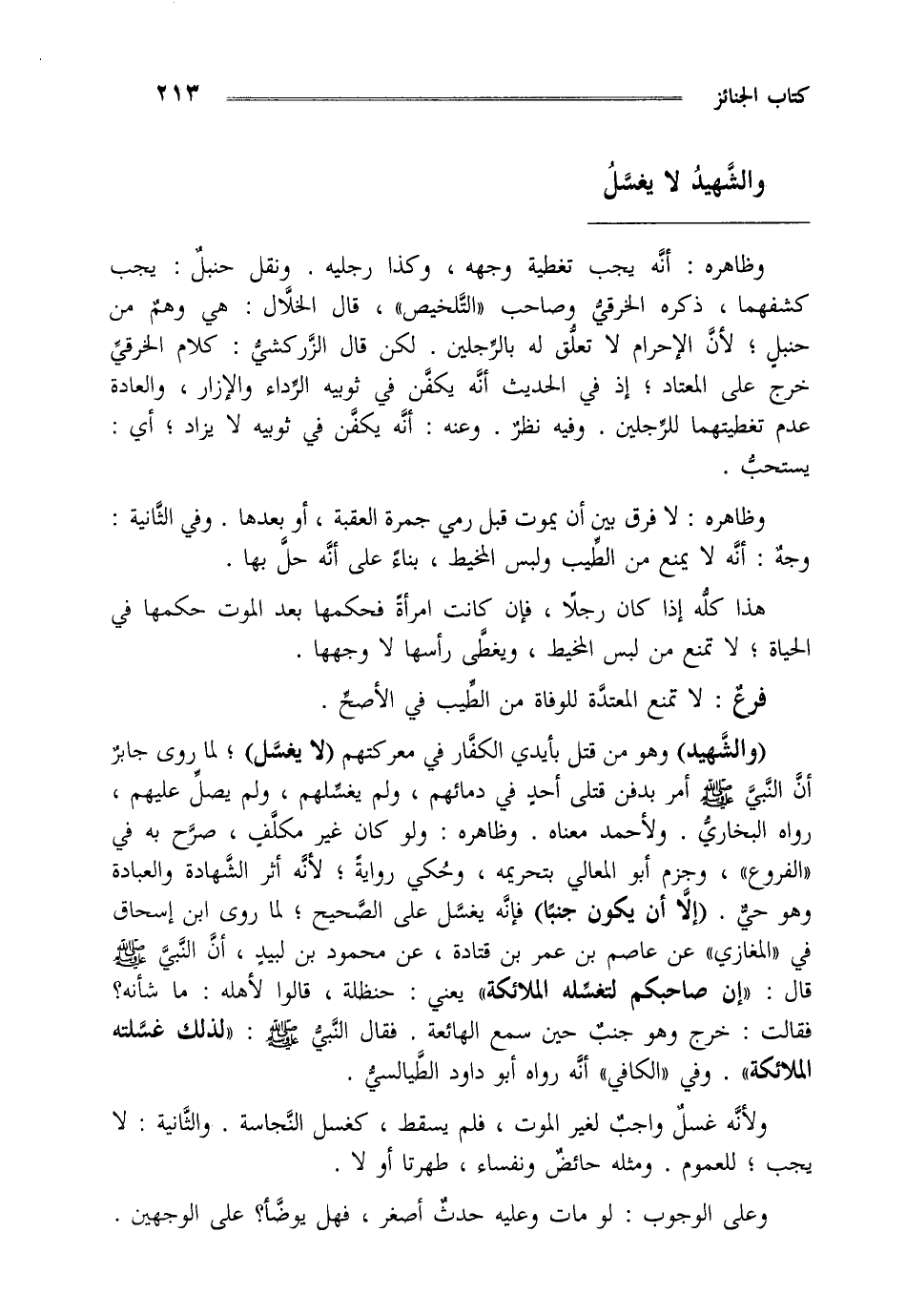 "والشهيد" وهو من قتل بأيدي الكفار في معركتهم "لا يغسل" لما روى جابر أن النبي صلى الله عليه وسلم أمر بدفن قتلى أحد في دمائهم ولم يغسلهم ولم يصل عليهم رواه البخاري ولأحمد معناه وظاهره ولو كان غيرمكلف صرح به في الفروع وجزم أبو المعالي بتحريمه وحكي رواية لأنه أثر الشهادة والعبادة وهو حي "إلا أن يكون جنبا" فإنه يغسل على الصحيح لما روى ابن إسحاق في المغازي عن عاصم بن عمر بن قتادة عن محمود بن لبيد أن النبي صلى الله عليه وسلم قال "إن صاحبكم لتغسله الملائكة" يعنى حنظلة قالوا لأهله ما شأنه فقالت خرج وهو جنب حين سمع الهائعة فقال النبي صلى الله عليه وسلم "لذلك غسلته الملائكة" وفي الكافي أنه رواه أبو داود الطيالسي