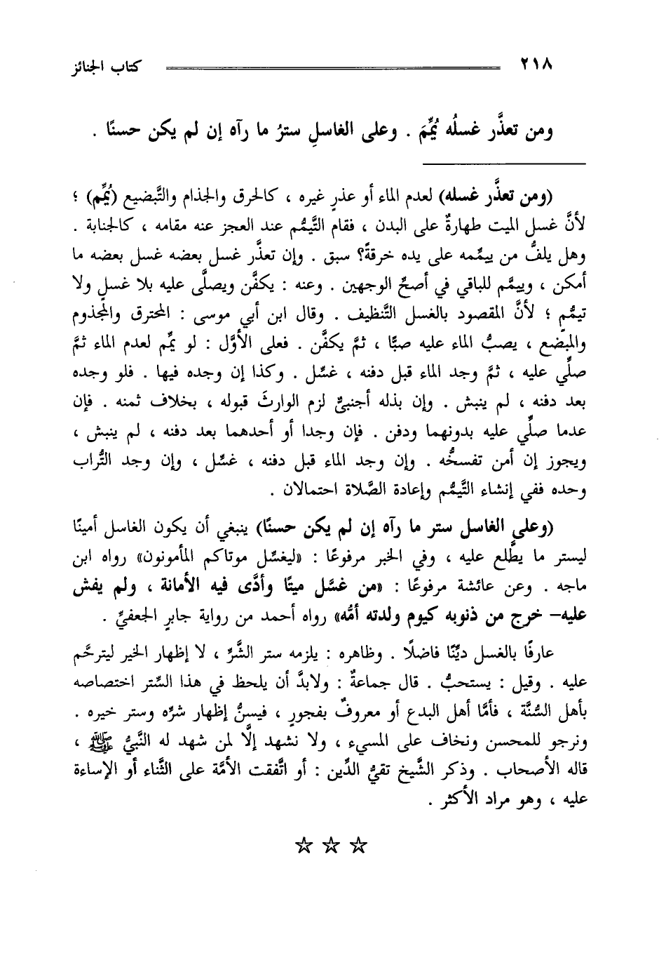 "وعلى الغاسل ستر ما رآه إن يكن حسنا" ينبغي أن يكون الغاسل أمينا ليستر ما يطلع عليه وفي الخبر مرفوعا عنه "ليغسل موتاكم المأمونون" رواه ابن ماجه وعن عائشة مرفوعا "من غسل ميتا وأدى فيه الأمانة ولم يفش عليه خرج من ذنوبه كيوم ولدته أمه" رواه أحمد من رواية جابر الجعفي.