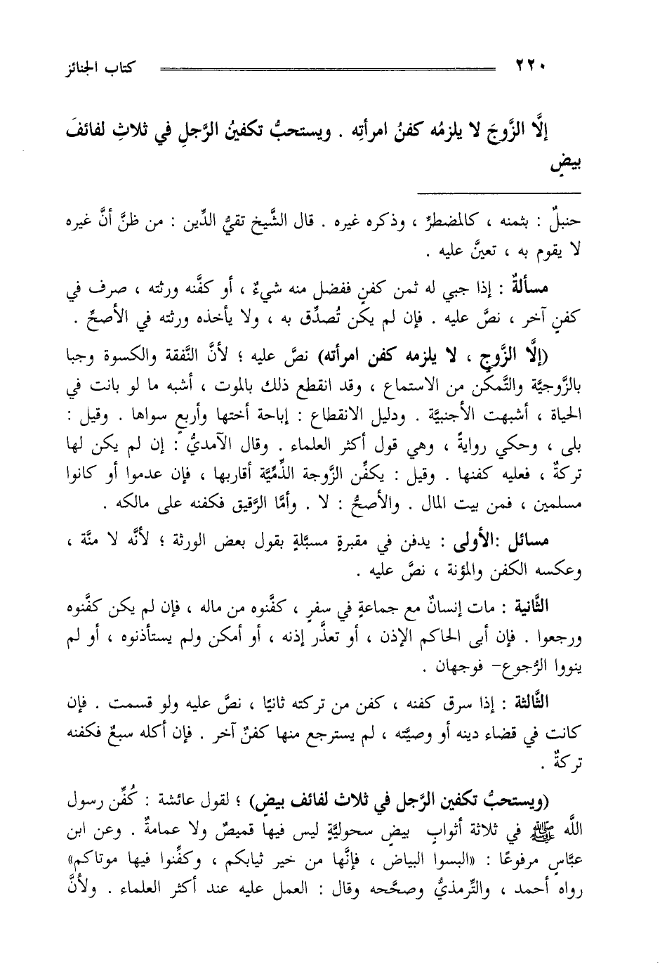 إلا الزوج لا يلزمه كفن امرأته ويستحب تكفين الرجل في ثلاث لفائف بيض.