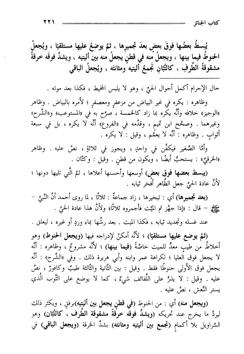 "ثم يوضع عليها مستلقيا" لأنه أمكن لإدراجه فيها "ويجعل الحنوط" وهو أخلاط من طيب معد للميت خاصة "فيما بينها" لأنه مشروع وظاهره أنه لا يجعل فوق العليا لكراهة عمر وابنه وأبي هريرة ذلك وفي الشرح أنه يجعل فوق الأولى حنوطا فقط وقيل بين الثانية والثالثة طيب وكافور نص عليه وقيل لا يذر على اللفائف شيء كما لا يوضع على الثوب الذي يستر النعش نص عليه.